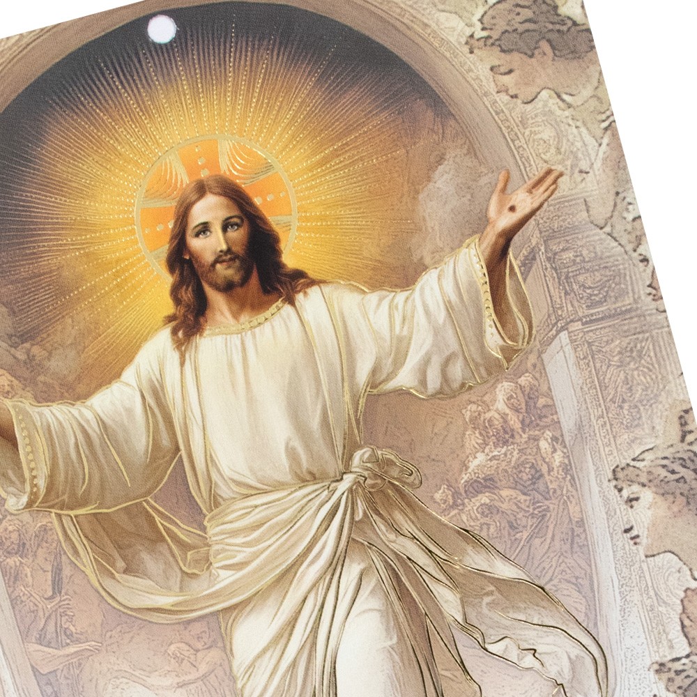 L'immagine armoniosa e luminosa del Salvatore con le braccia aperte, comunica forza e fede, impreziosita con dettagli oro a caldo.