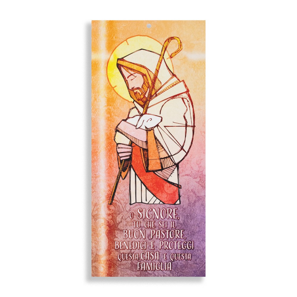 Cartonicno benedizione della Famiglia, realizzata in carta perlata con immagine stampata e raffigurante Gesù Buon Pastore sul fronte.