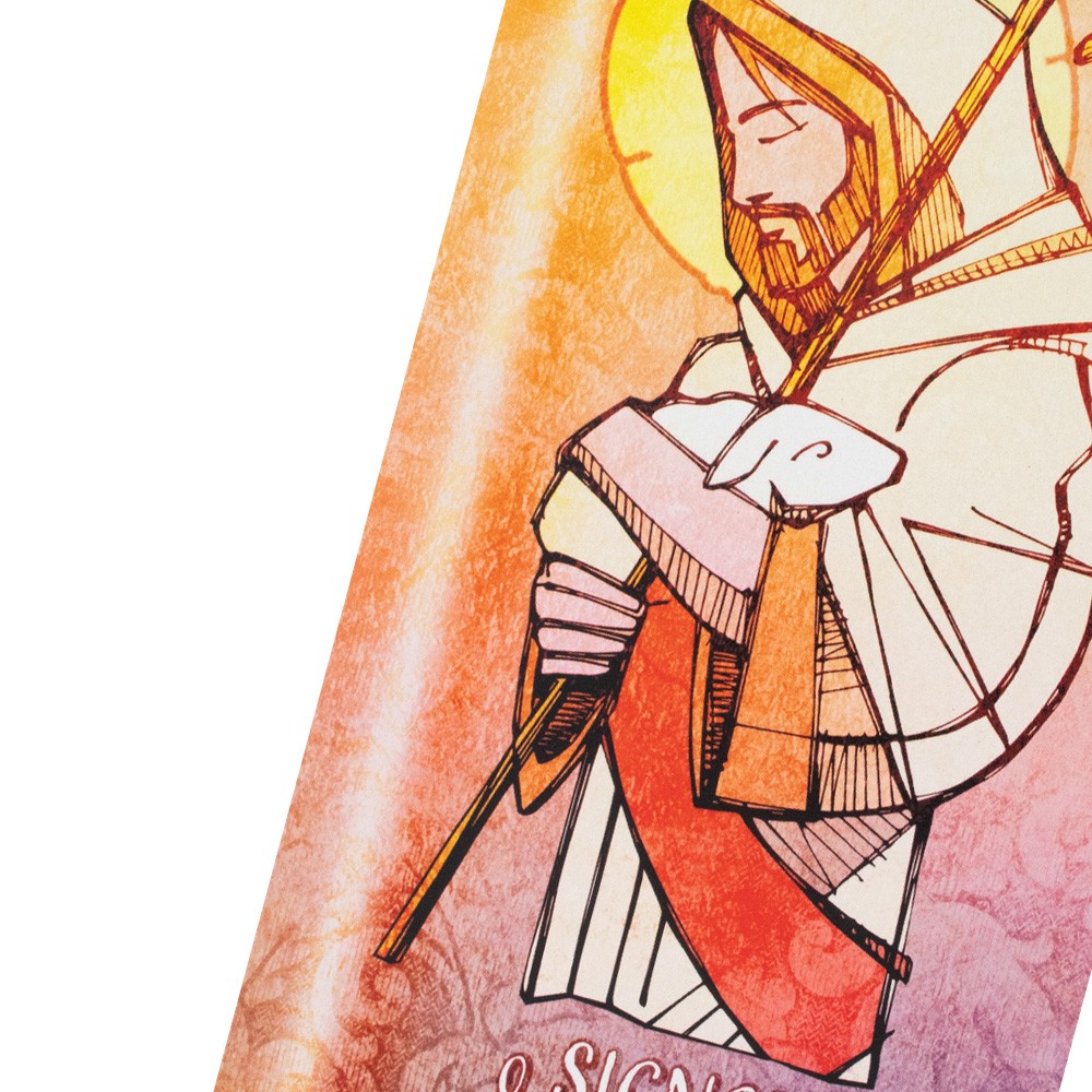 Lo stile moderno e stilizzato, unito ai colori luminosi, conferisce a questa immagine sacra un aspetto sobrio e raffinato.