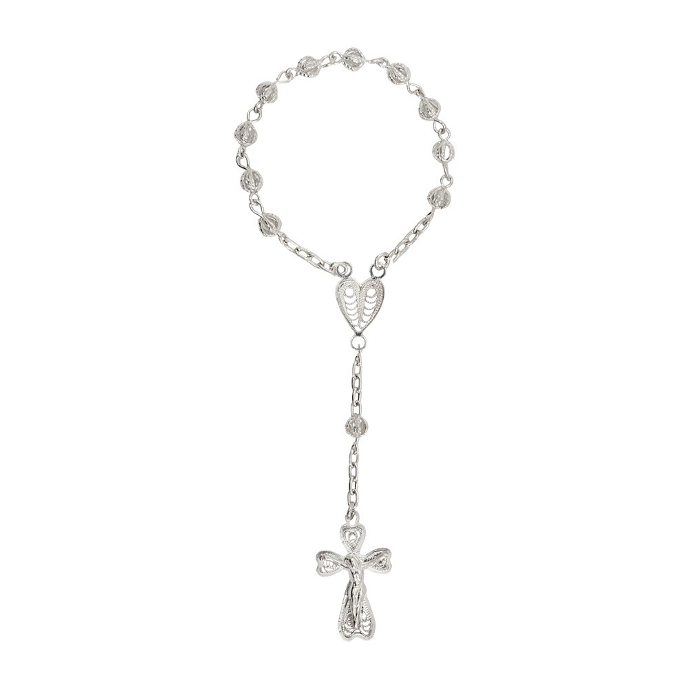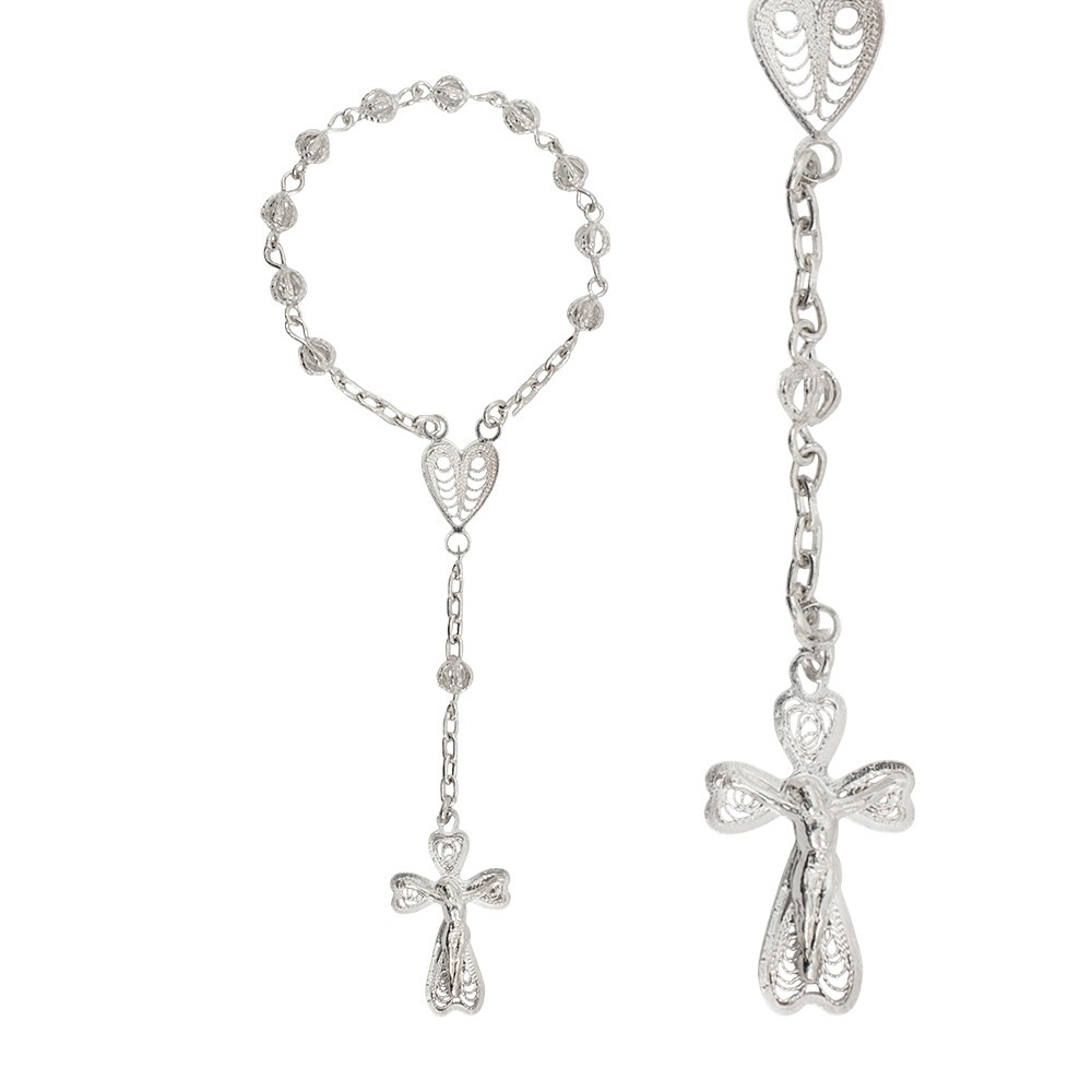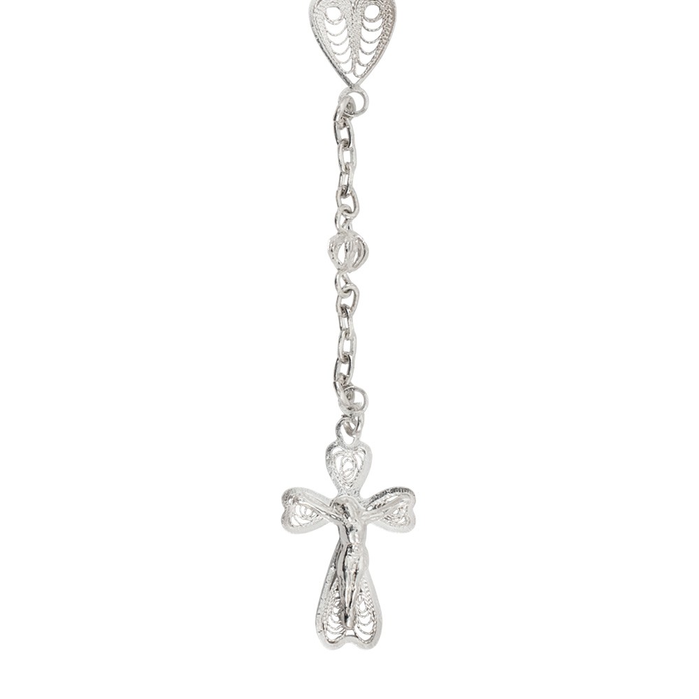 Decina Rosario realizzata in elegante filigrana d’argento, lunga circa 12 cm. I grani, dal diametro di 0,3 cm, sono piccoli e tondi, perfetti da portare con sé in tasca o in borsa.