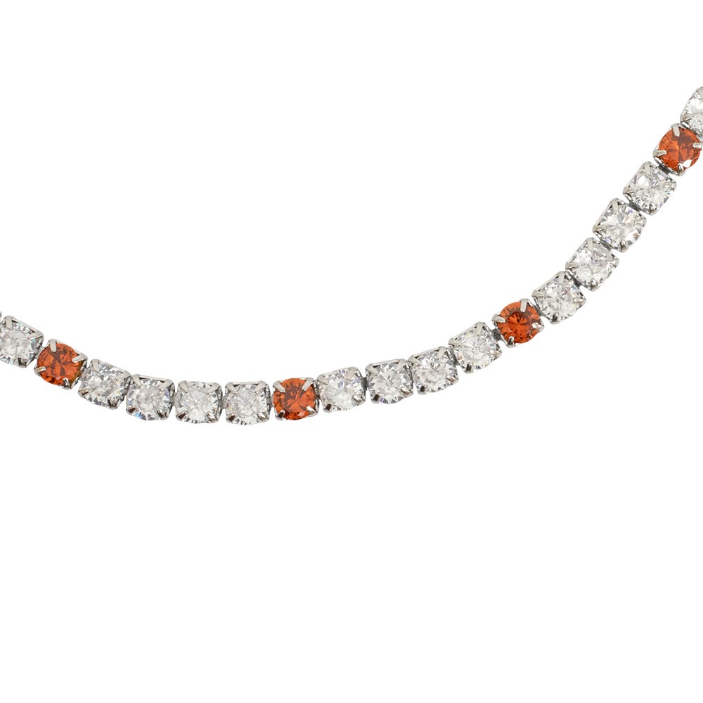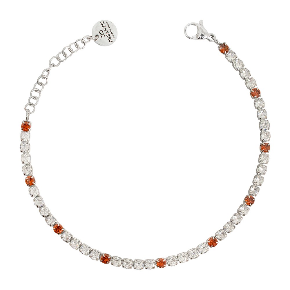 Bracciale modello Tennis realizzato in acciaio inossidabile, impreziosito da zirconi arancioni e trasparenti. Il design lineare e luminoso dona un tocco di eleganza e raffinatezza, rendendolo un accessorio ideale da indossare quotidianamente o per valorizzare un look nelle occasioni speciali.