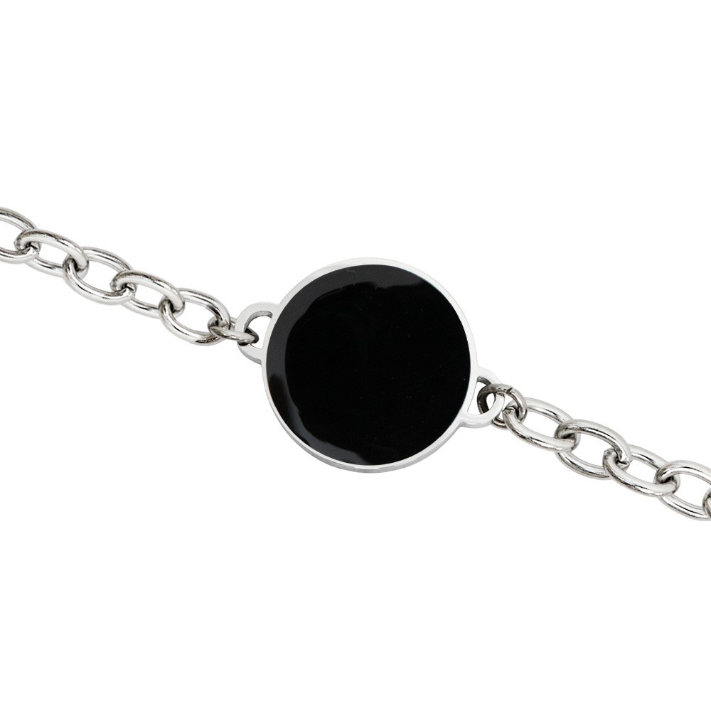 Realizzato in acciaio 316L, integra un microchip con tecnologia Joylocker® per conservare i tuoi ricordi più preziosi. La catena a maglie ovali da 21 cm sostiene un charm piatto a forma tonda (altezza 1,8 cm) con impronta e smalto nero sul retro, completato da una pratica chiusura a moschettone.