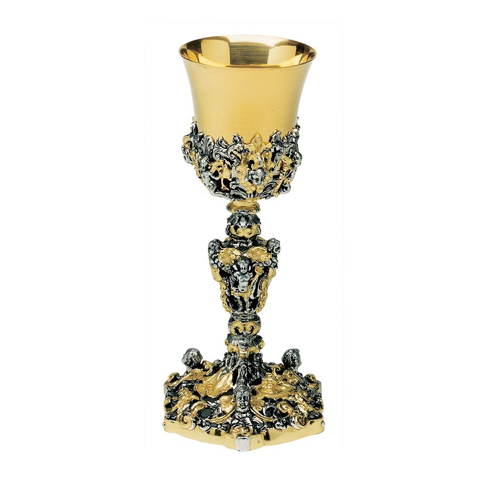 Calice da eucarestia in ottone bicolore eseguito mediante la tecnica della fusione a cera persa. Il calice è decorato da ornamenti traforati, con testine di angeli e simboli religiosi sulla base.