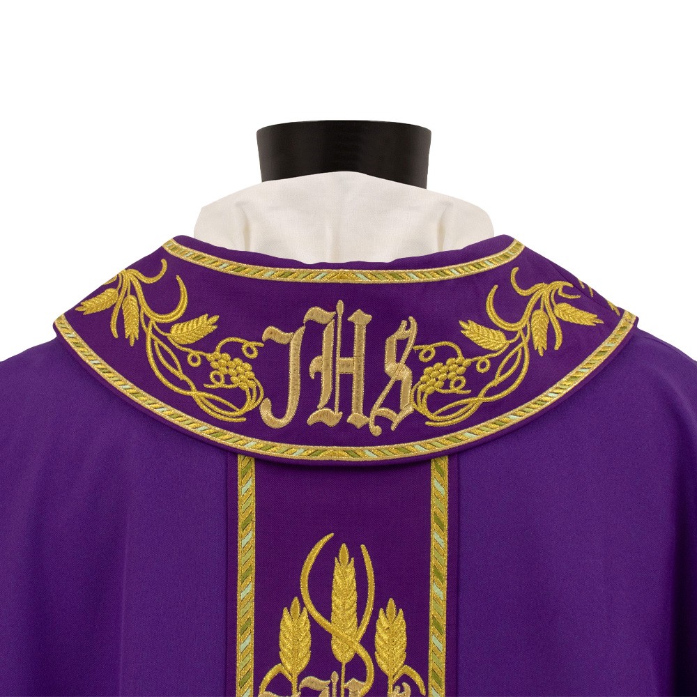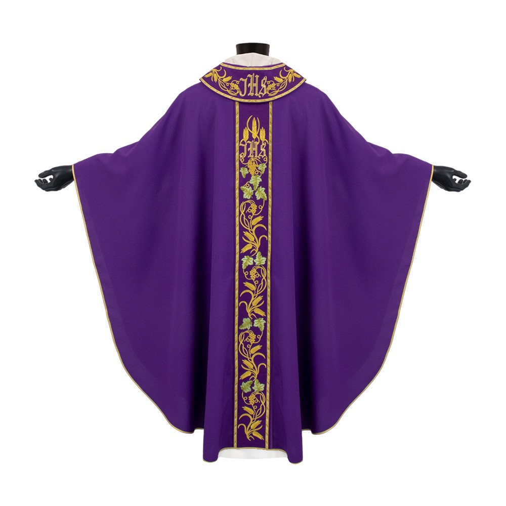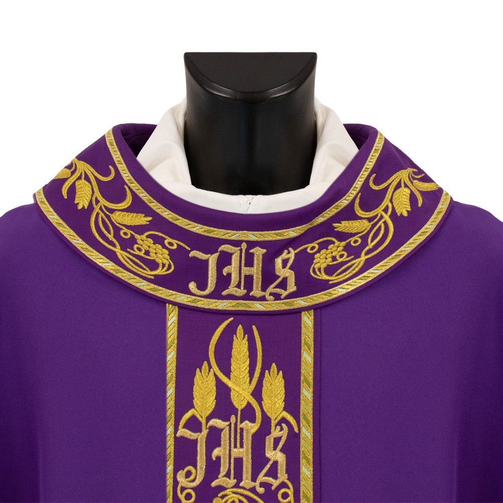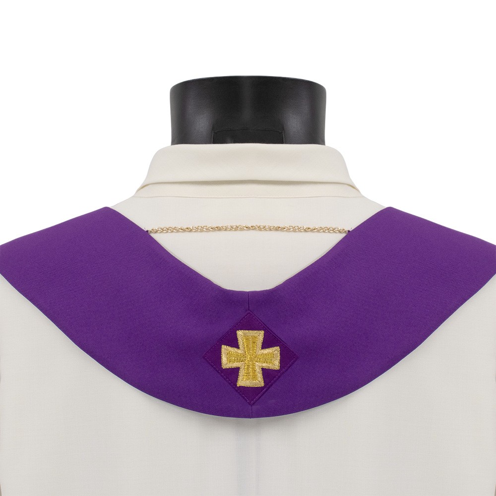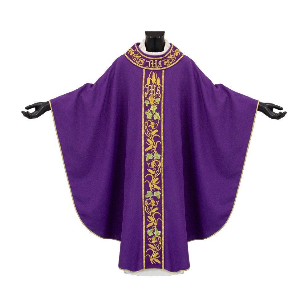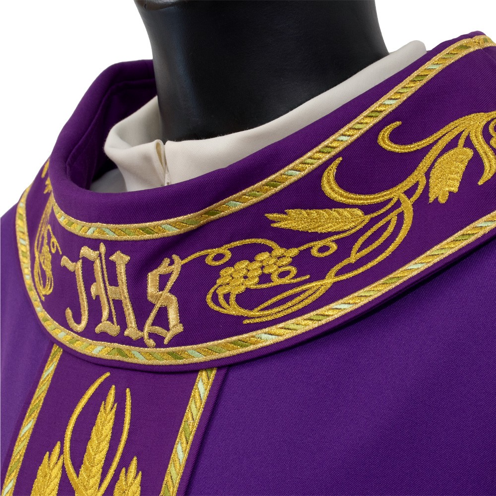 Elegante casula per sacerdote di colore viola con stolone e collo ricamati, realizzata in leggero tessuto poliestere.