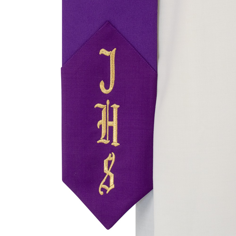 Casula liturgica viola dal design essenziale, con collo ad anello e stola abbinata rifinita con frangia dorata. Ideale per Avvento e Quaresima.