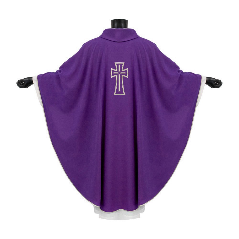 La casula è rifinita con sbieco perimetrale color argento, perfettamente coordinato con il ricamo della croce, per un risultato armonioso e sobrio.