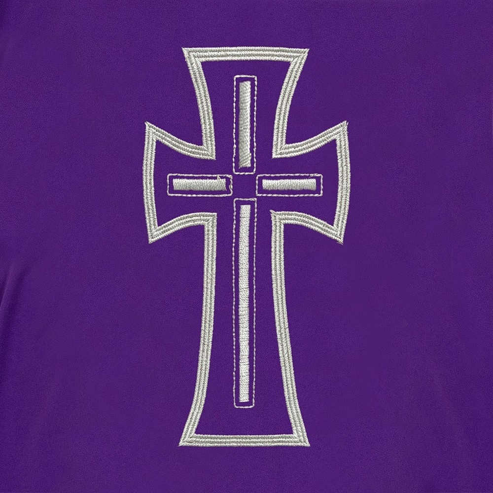 Il ricamo raffigurante una croce stilizzata, presente sia sul lato anteriore che su quello posteriore, è eseguito interamente a macchina con telai di ottima qualità, utilizzando filati color argento, in grado di garantire eleganza e durata nel tempo.