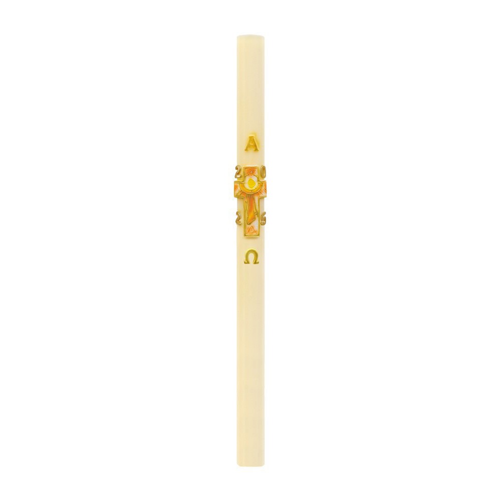 Cero liturgico in cera gialla dipinto a mano, ideale per essere inserito all'innesto per il cero pasquale.