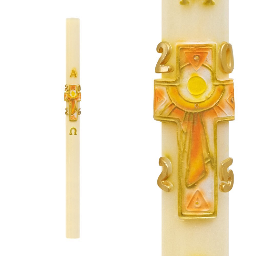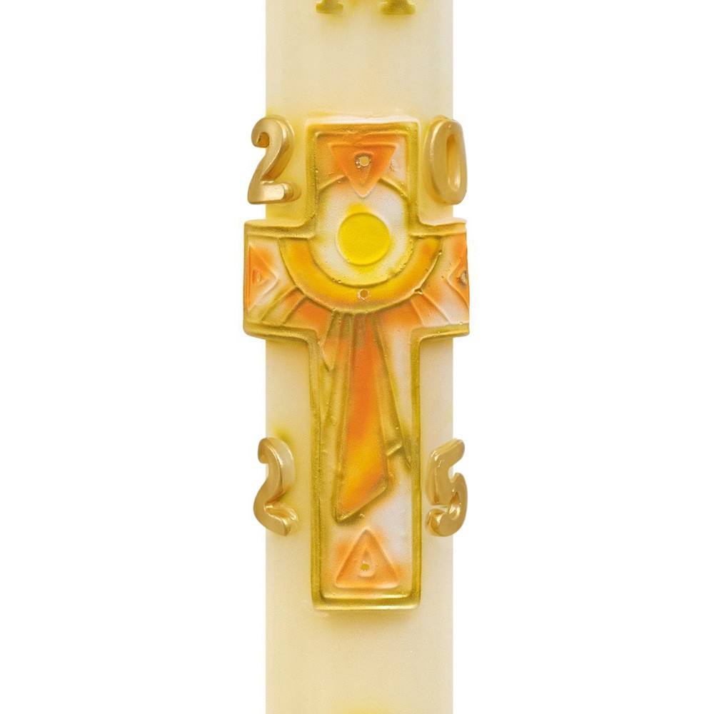 Candela pasquale 150x8 cm in paraffina di ottima qualità con croce, Gesù Risorto e anno liturgico in rilievo.