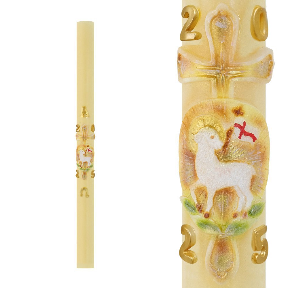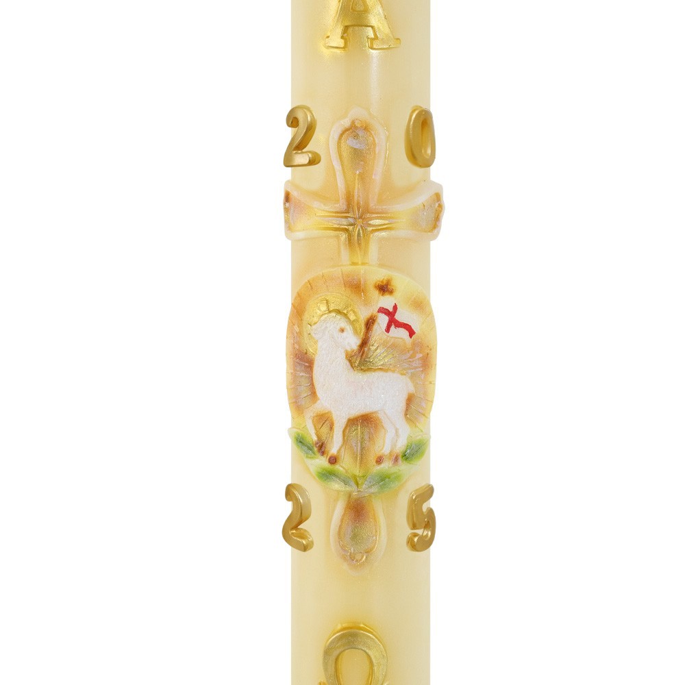 Cero Pasquale realizzato in cera di altissima qualità e con decori in rilievo agnello, Croce, Alfa e Omega. Prodotto da un'azienda italiana.