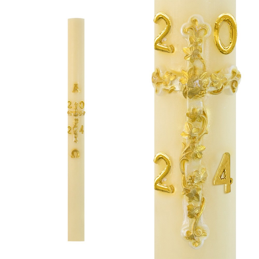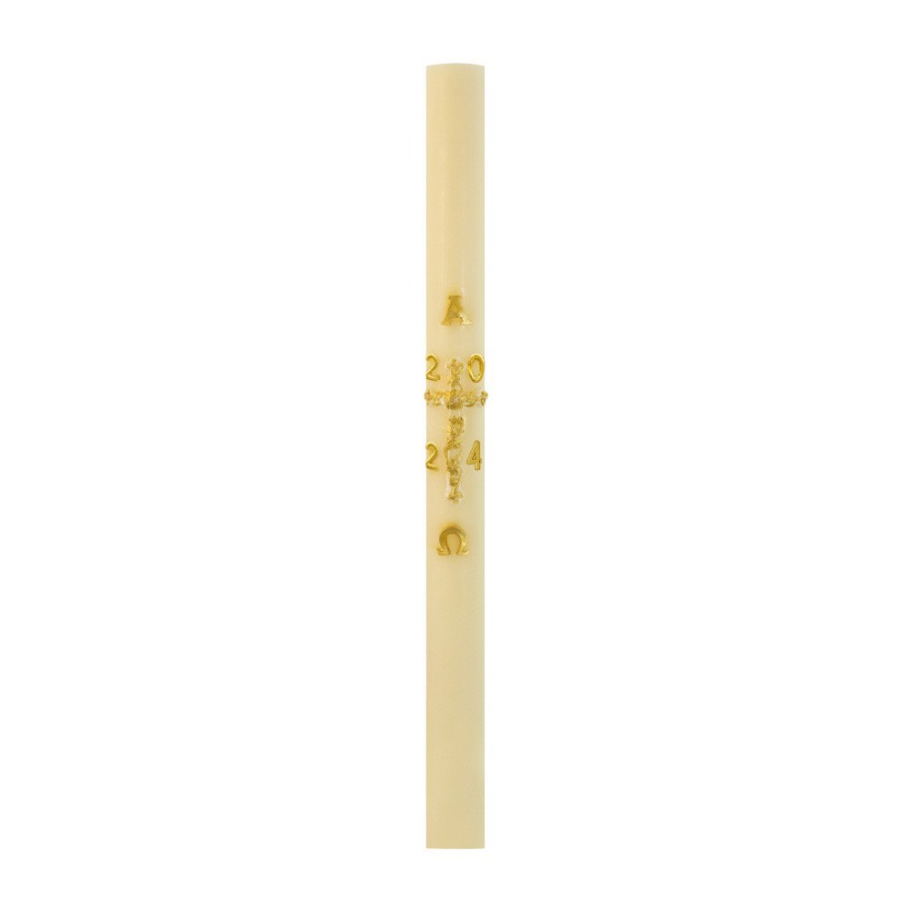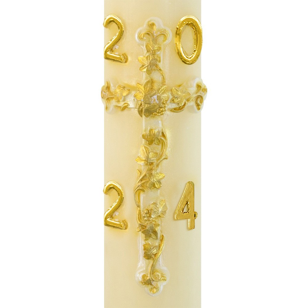 Questo cero pasquale è realizzato in paraffina di altissima qualità, con applicazioni in rilievo. Sul cero pasquale è applicato in rilievo la croce e l'anno liturgico attuale.