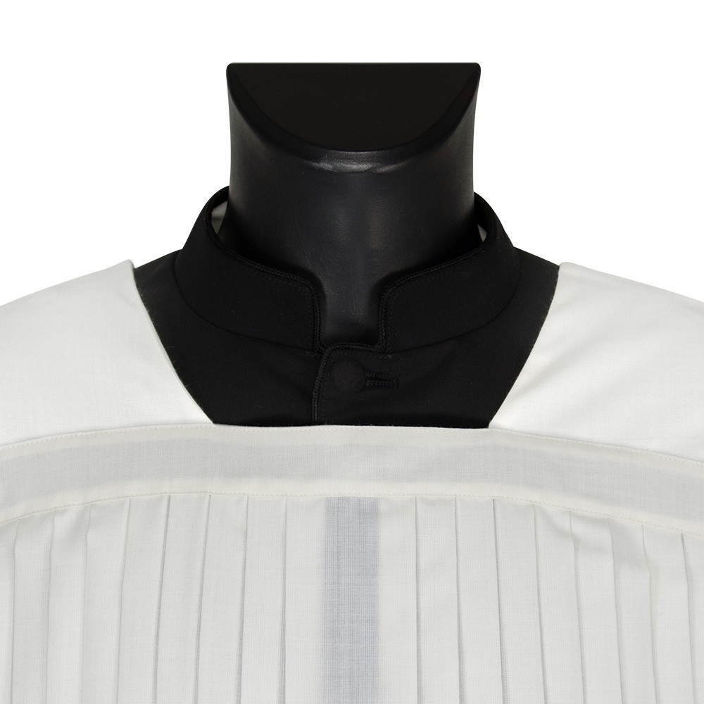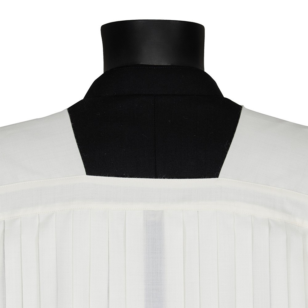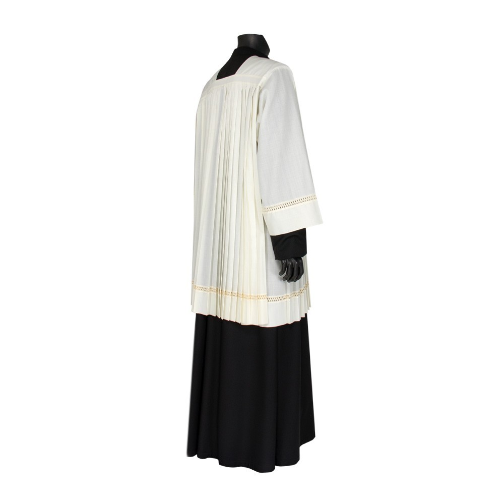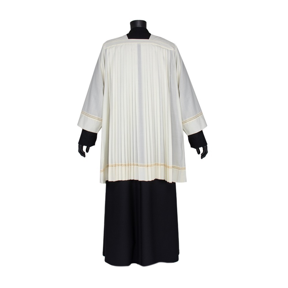 Cotta plissettata in tessuto pregiato misto lana per seminaristi, diaconi e sacerdoti. Questa veste liturgica è di colore avorio realizzata con un filo di finto gigliuccio presente in fondo e sulle maniche. Modello classico con collo quadro e piegoni. Prodotto 100% italiano.