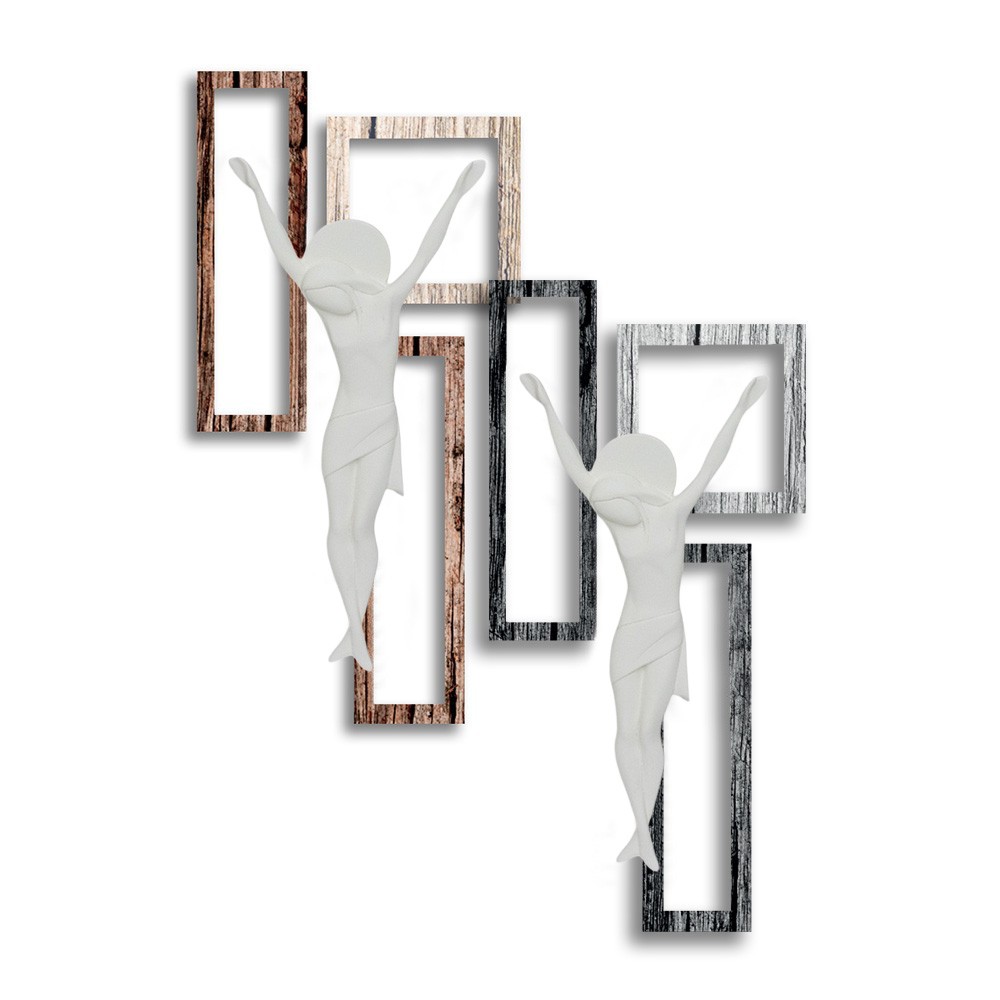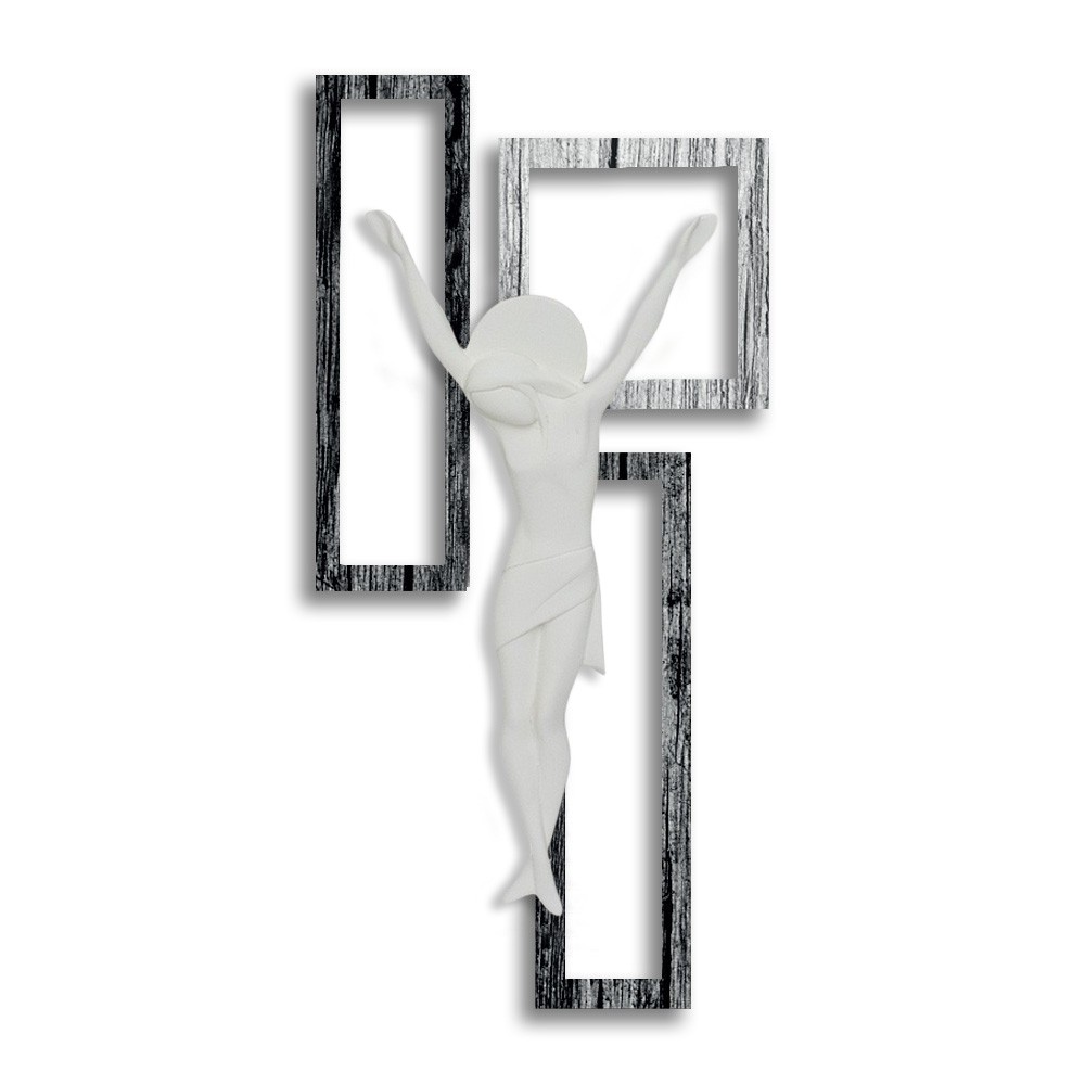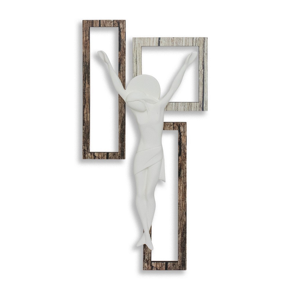 Crocifisso dal design moderno con fondo composto da più pannelli in fibra di legno e Cristo in marmorino bianco.