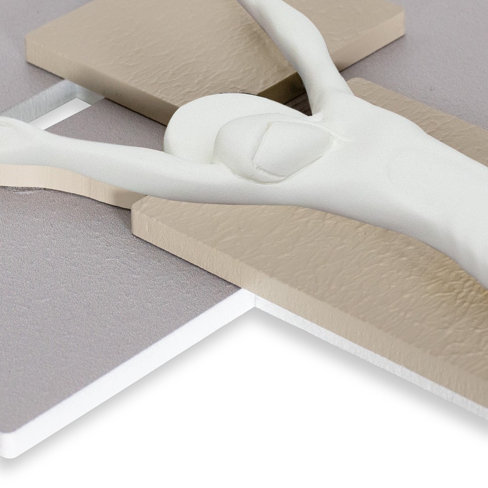 La croce è da parete con corpo di Gesù Cristo in marmorino bianco satinato, con fondo composto da più pannelli in fibra di legno colorata.