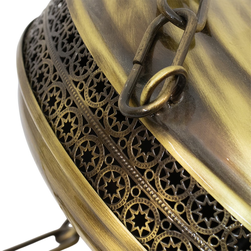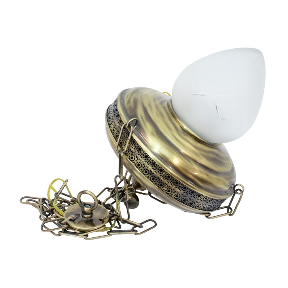 La lampada è in ottone bronzato, viene fornita con attacco elettrico 220 volt, catena da circa 66 cm di lunghezza e vetro a forma di goccia.