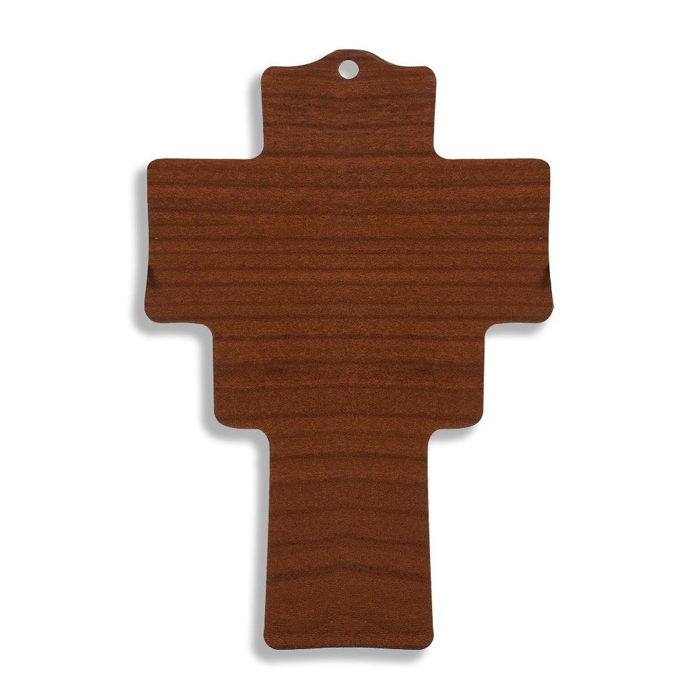 La croce è in legno MDF con stampa dei simboli eucaristici del sacramento arricchiti con dettagli dorati.