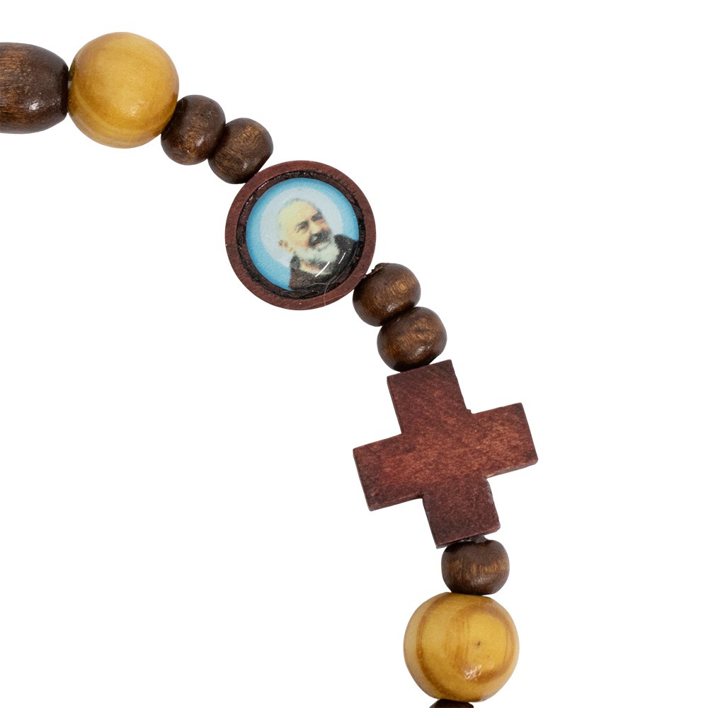 Bracciale Padre Pio con grani in legno chiaro e scuro, alternati tondi e ovali.