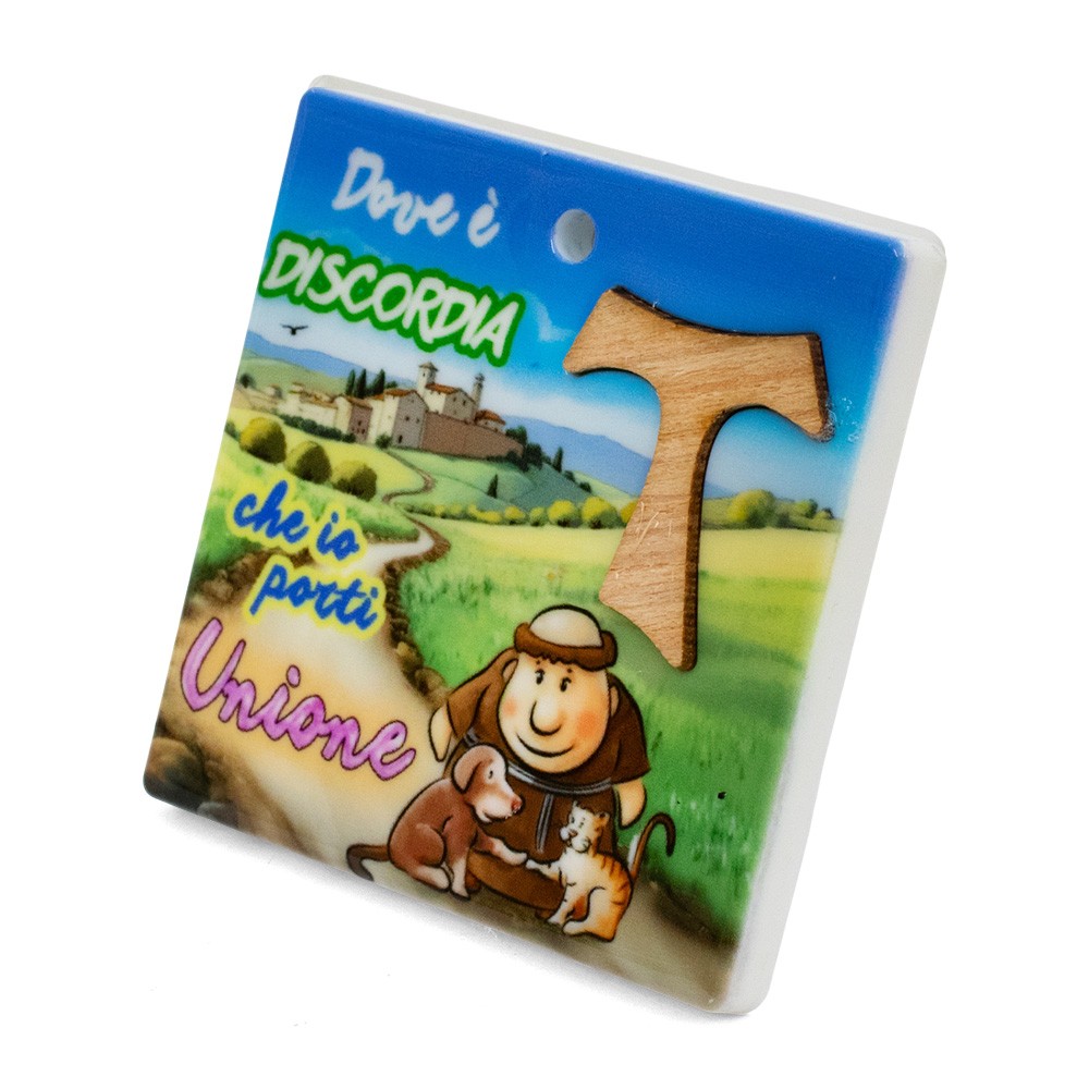 Il magnete è quadrato (6x6 cm) realizzato in polimero, unisce funzionalità e significato spirituale. Presenta la frase “Dove è discordia che io porti UNIONE” e può essere utilizzato come magnete da fissare su superfici metalliche o come piccolo quadretto da appoggio grazie al piedino in metallo.