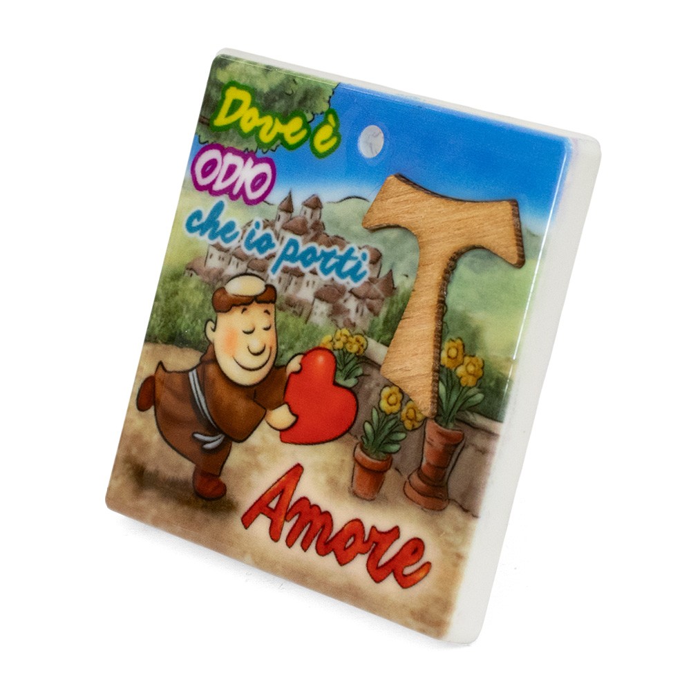 Questo magnete quadrato da 6x6 cm unisce funzionalità e significato spirituale. Presenta la frase “Dove è Odio che io Porti Amore” e può essere utilizzato come magnete da fissare su superfici metalliche o come piccolo quadretto da appoggio grazie al piedino in metallo.