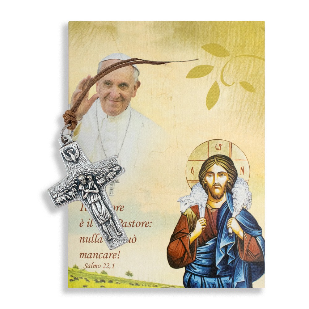 Pendente croce di Papa Francesco, una versione mini da portare al collo, completo di laccetto in corda marrone, il tutto racchiuso in un comodo blister trasparente con cartoncino decorato, sul fronte vi è l'immagine di Papa Francesco che saluta Gesù Buon Pastore, mentre sul retro la citazione della parola di Gesù Buon Pastore.