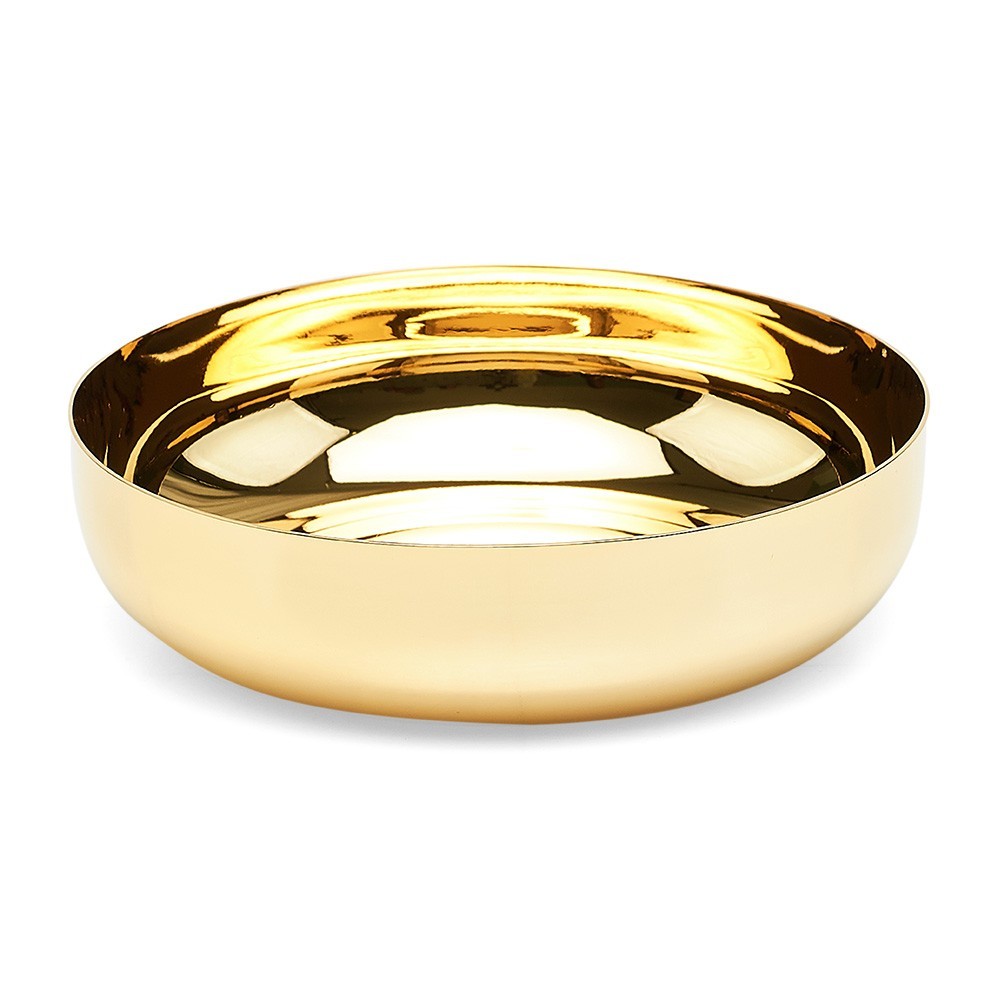 Patena offertoriale senza base realizzata interamente in ottone con finitura dorata.