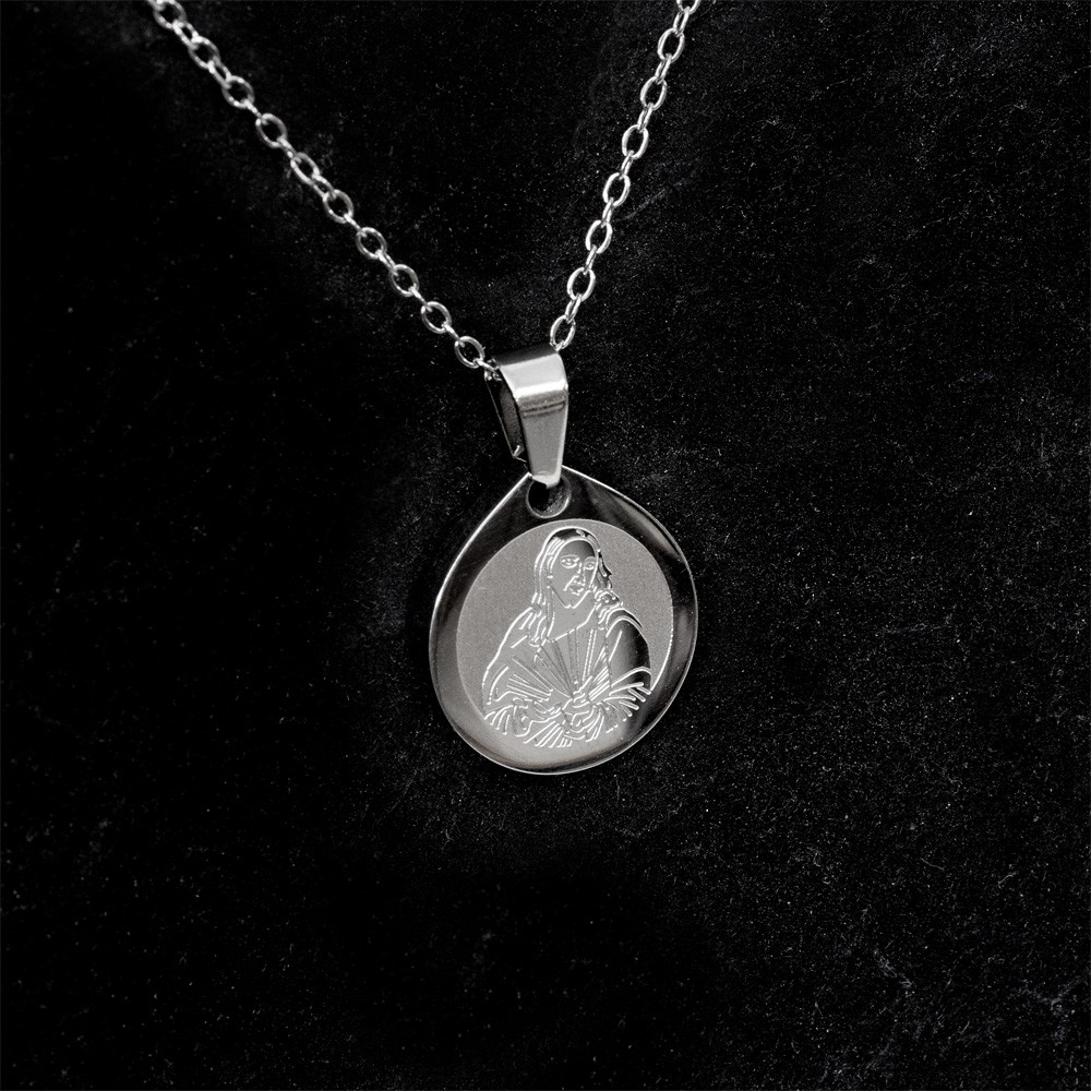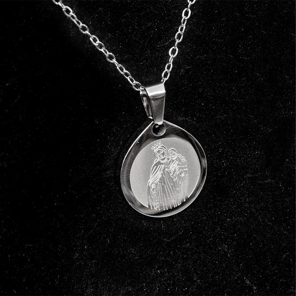 Collana con medaglietta della Madonna del Carmine. La medaglietta e la catenina sono in acciaio inox completa di gancio per l'apertura e chiusura.