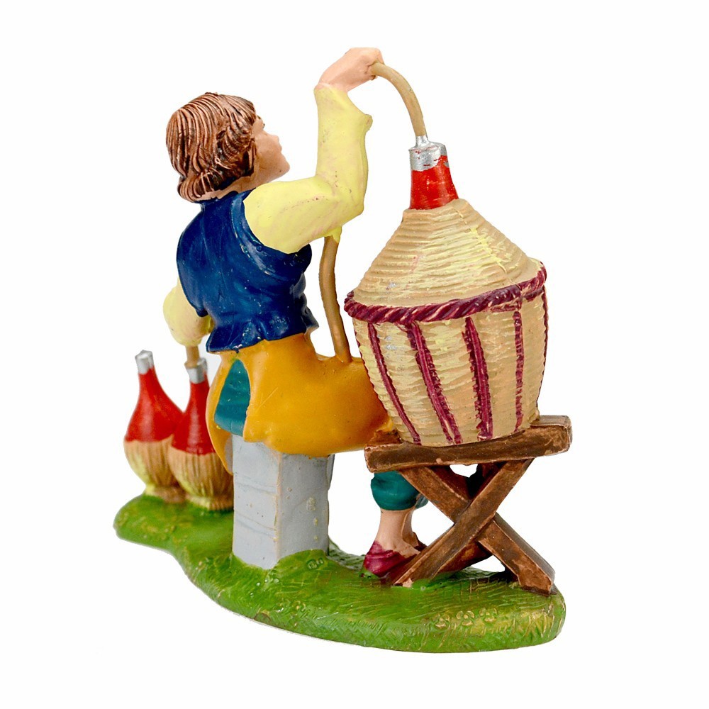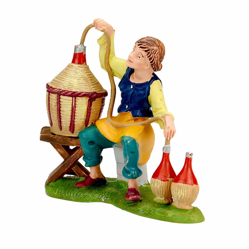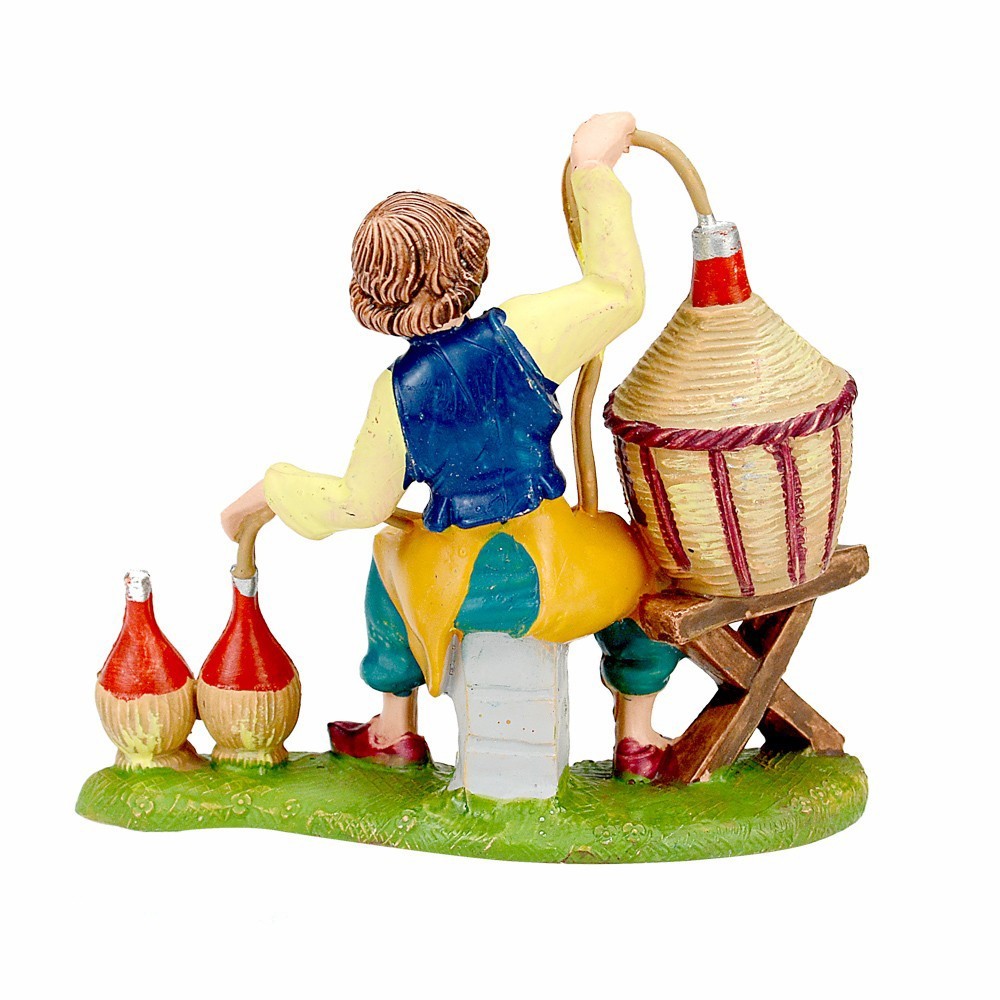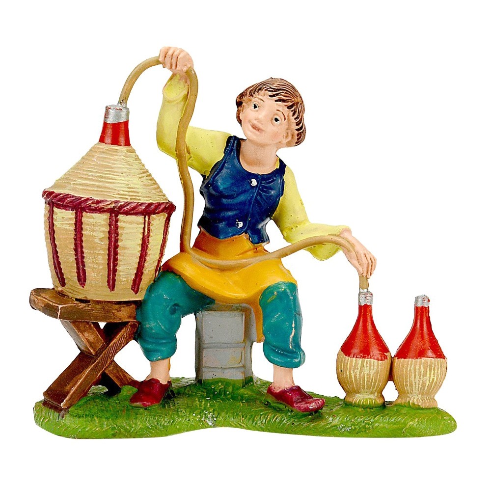 Uomo seduta con damigiana e bottiglie Fontanini. La statuetta è adatta per il Presepe Fontanini da 10 cm.