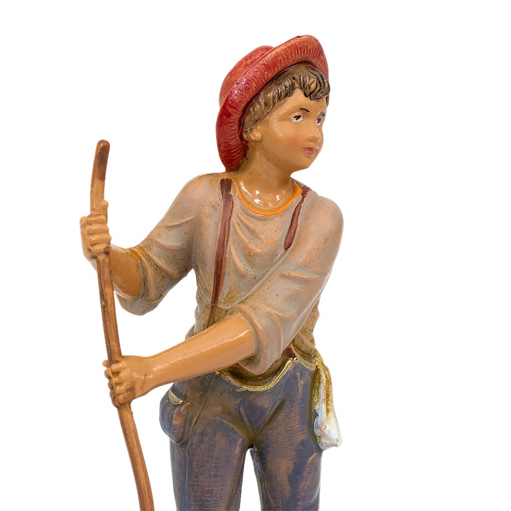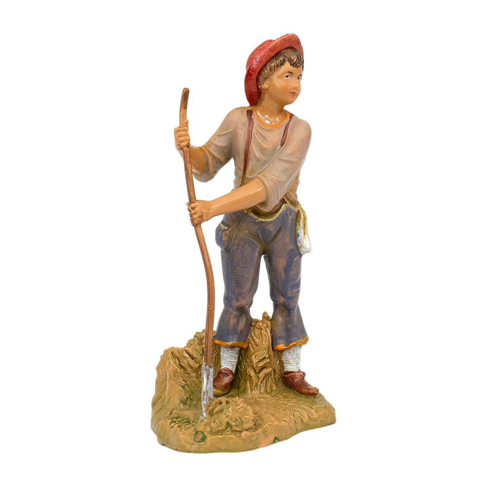 Statua giovane pastore con cappello e forcone per presepe Fontanini 12 cm, realizzata in PVC dipinta a mano con cura artigianale.