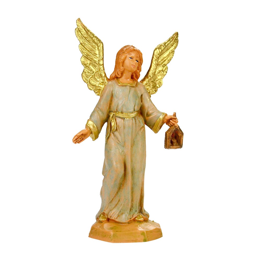 Angelo in Piedi, con veste di colore azzurro e ali dorate. La statuella è adatta per Presepe Fontanini da 9,5 cm.