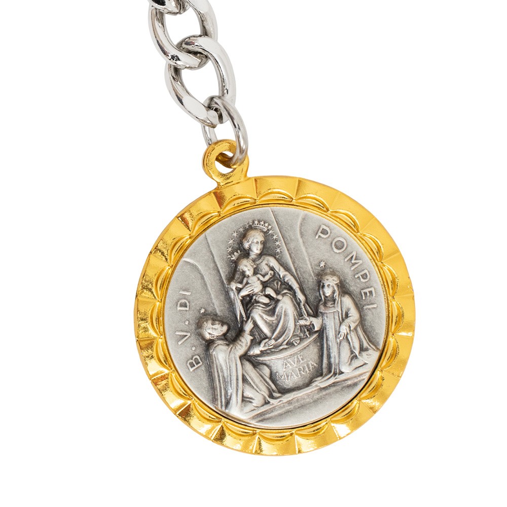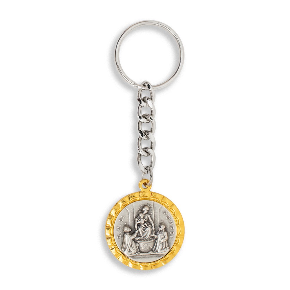Portachiavi tondo della Madonna di Pompei, realizzato in metallo dorato e argentato.