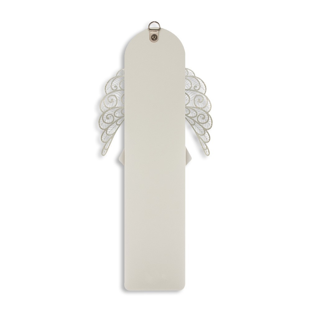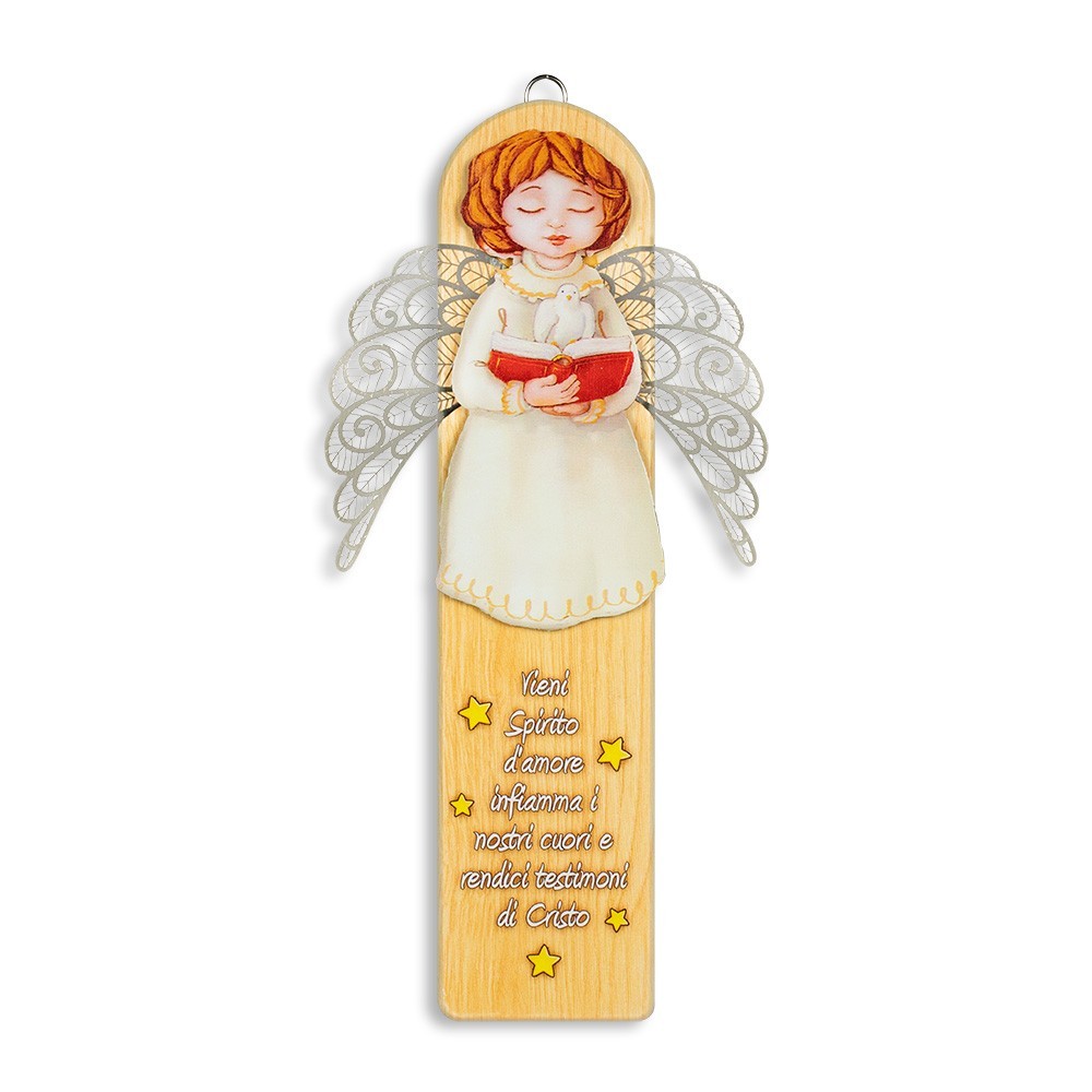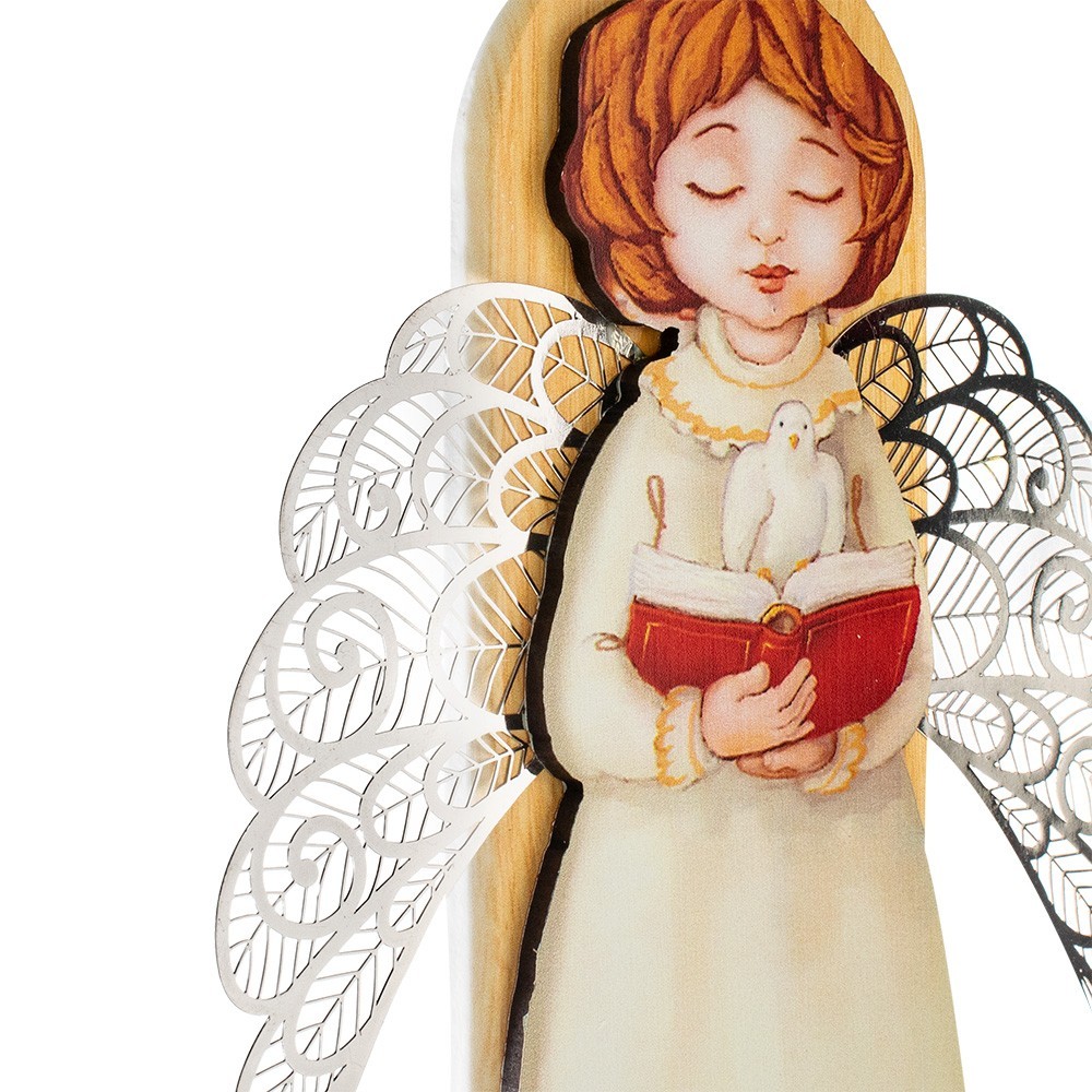 L'immagine dell'angioletto è posta in rilievo con ali traforate in metallo. Dotato di foro in metallo argentato per poterlo appendere.