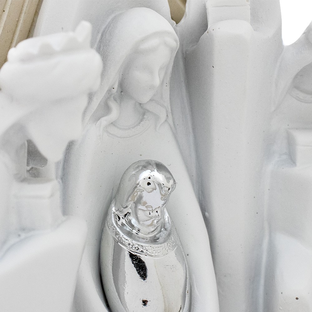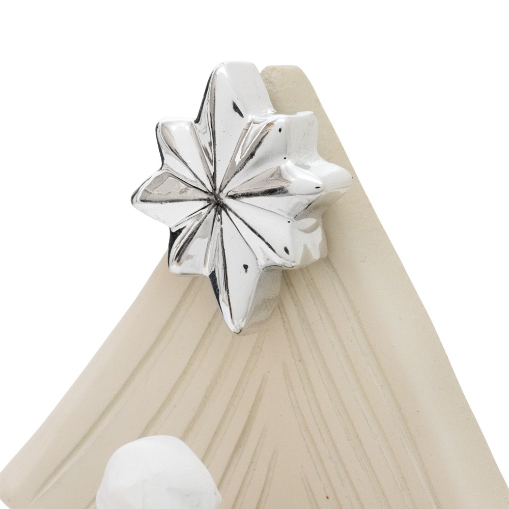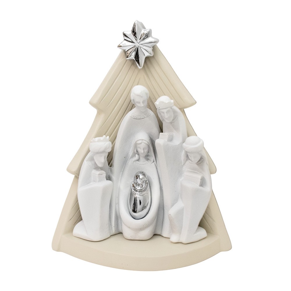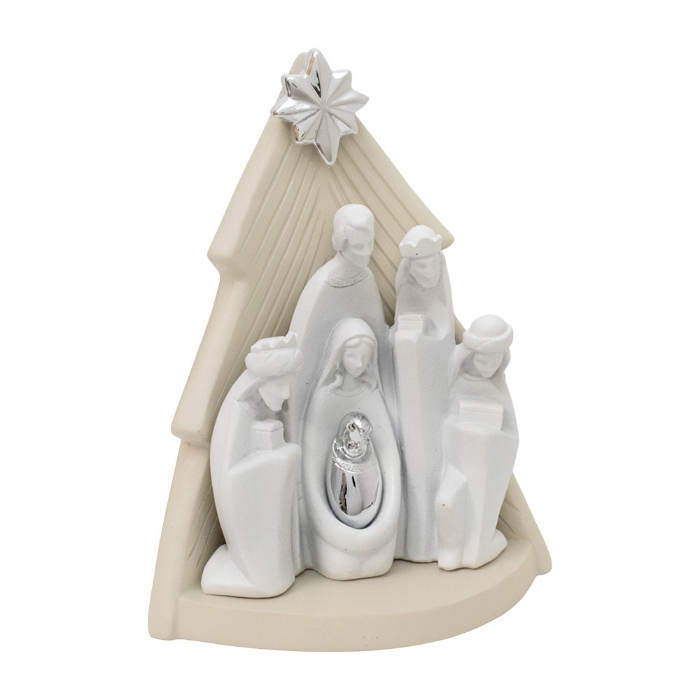 I personaggi sono realizzati in resina bianca, mentre Gesù Bambino e la stella cometa sono in metallo argentato, creando un bel contrasto di materiali.