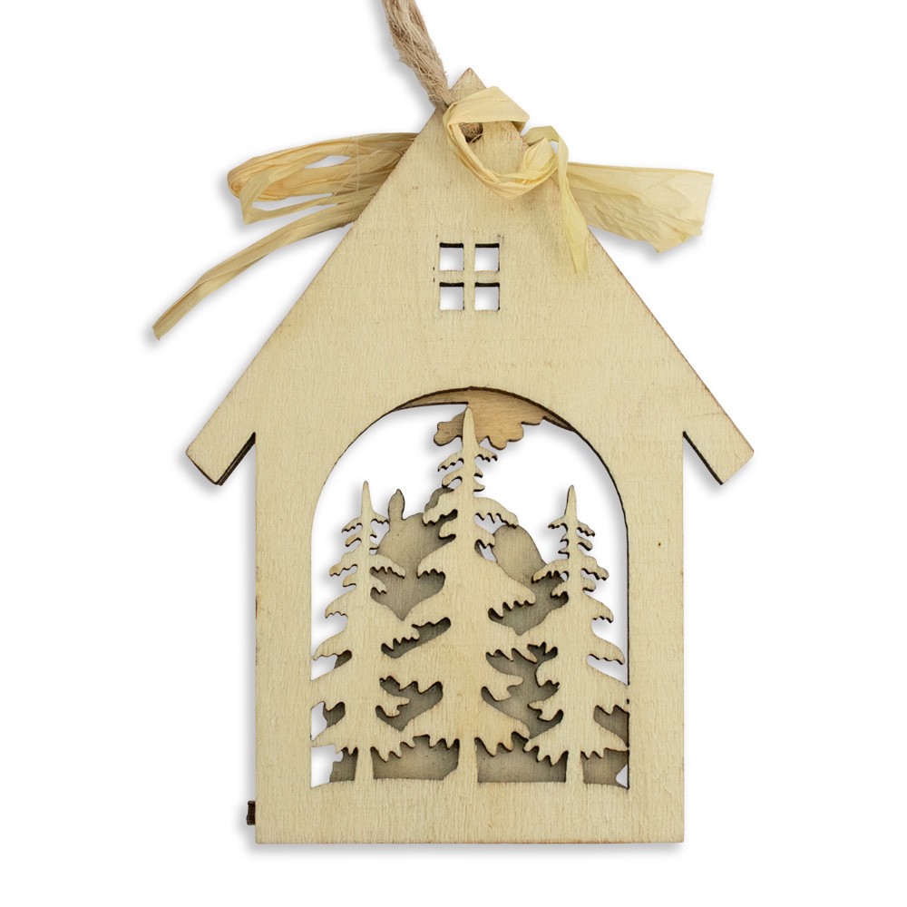 Appendino natalizio in legno per albero di Natale, realizzato a forma di mini casetta con natività.
