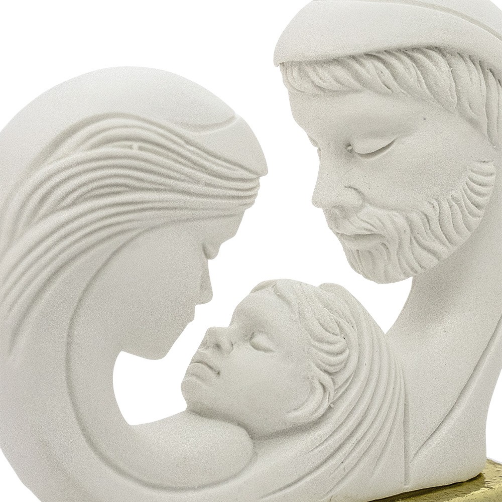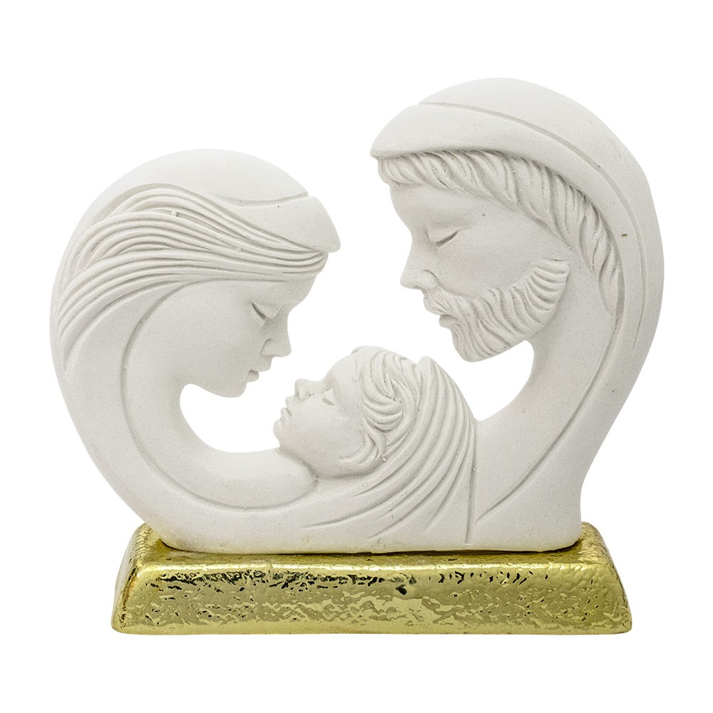 Statuetta dela Sacra famiglia in resina bianca con base dorata.