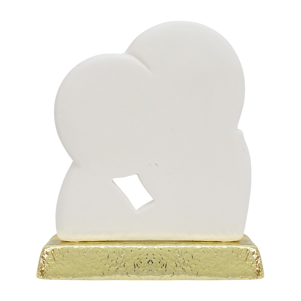 Sacra famiglia in resina bianca con base dorata, dimensioni 8x7 cm.