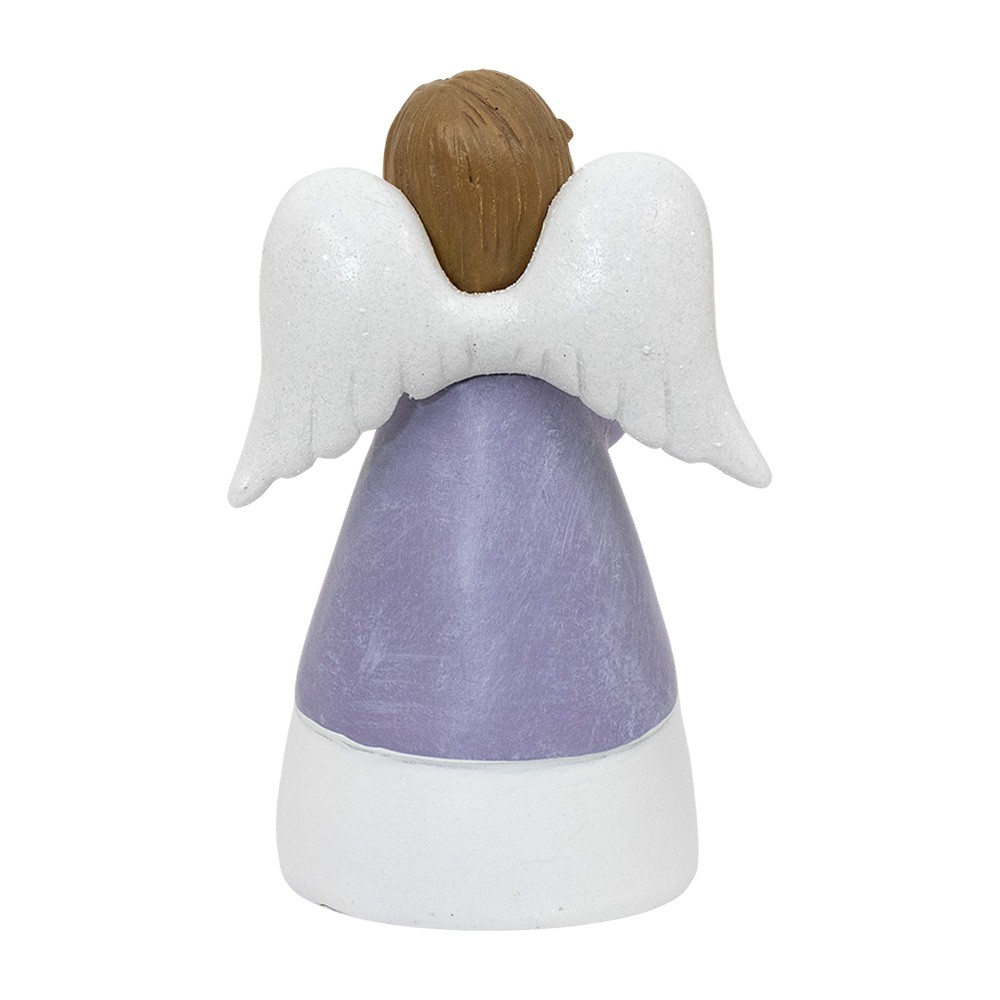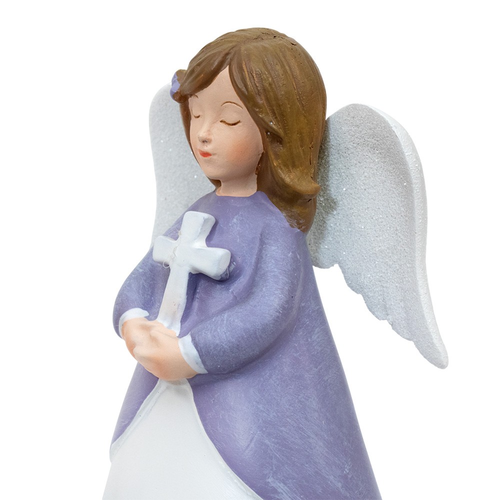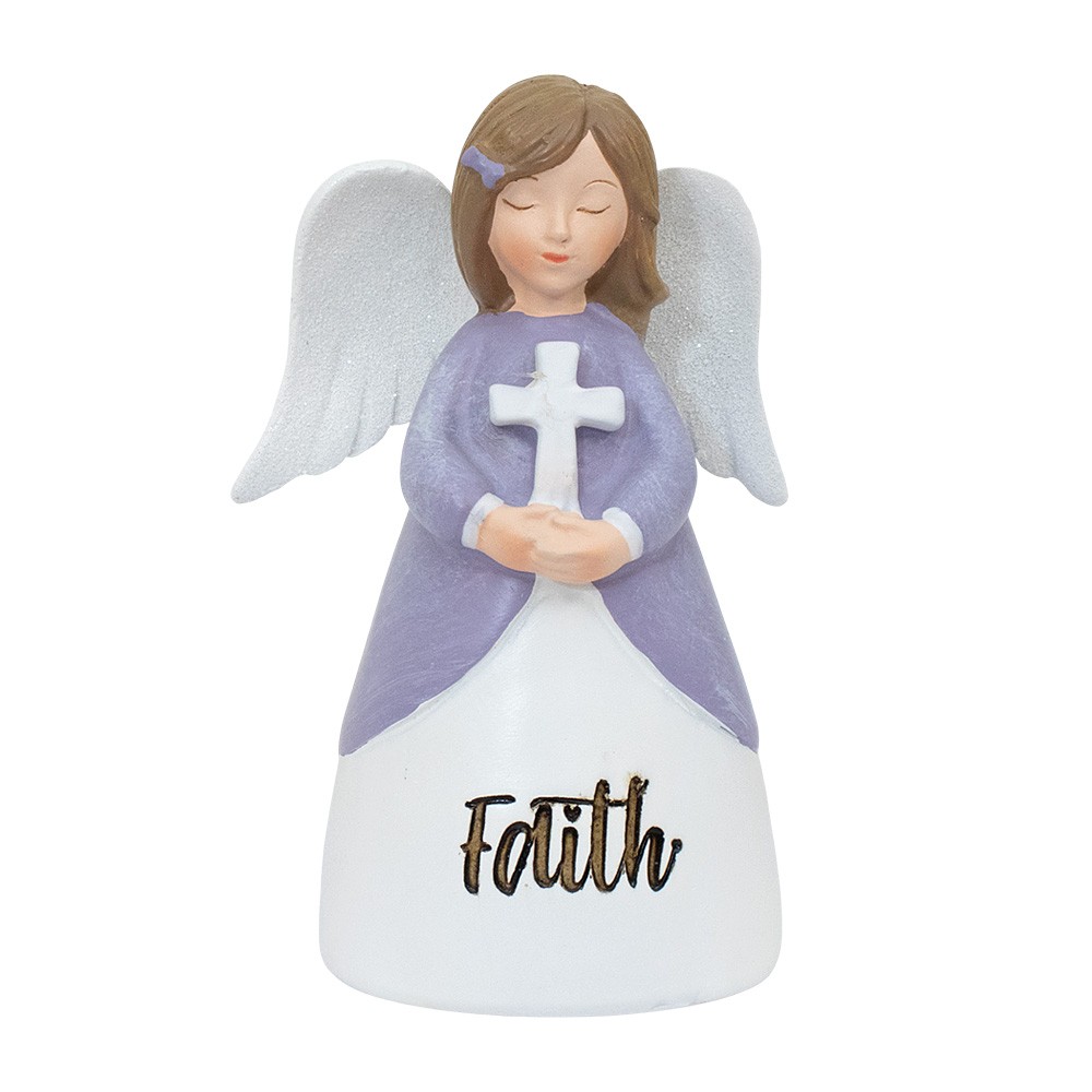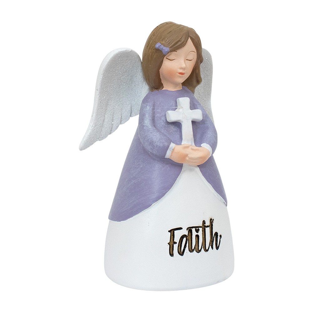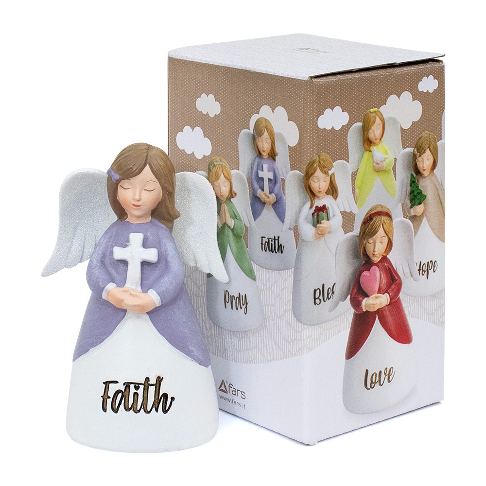 Carinissima statuetta Angelo in resina dipinto a mano, con veste viola che porta una cricifisso tra le mani. L'angioletto riporta la scritta "FAITH" e misura 11 cm di altezza.