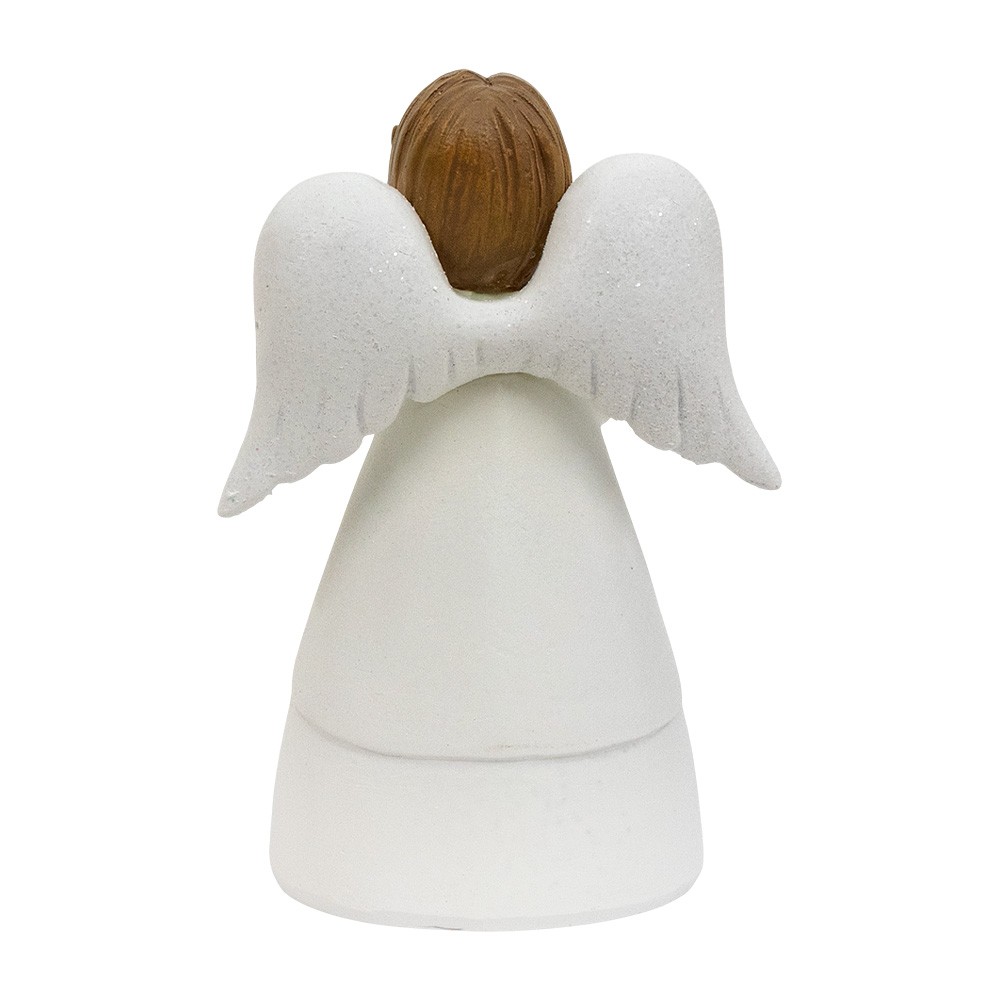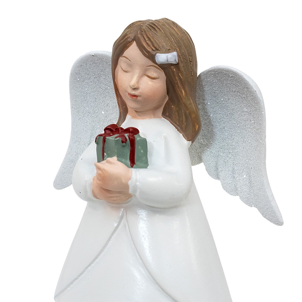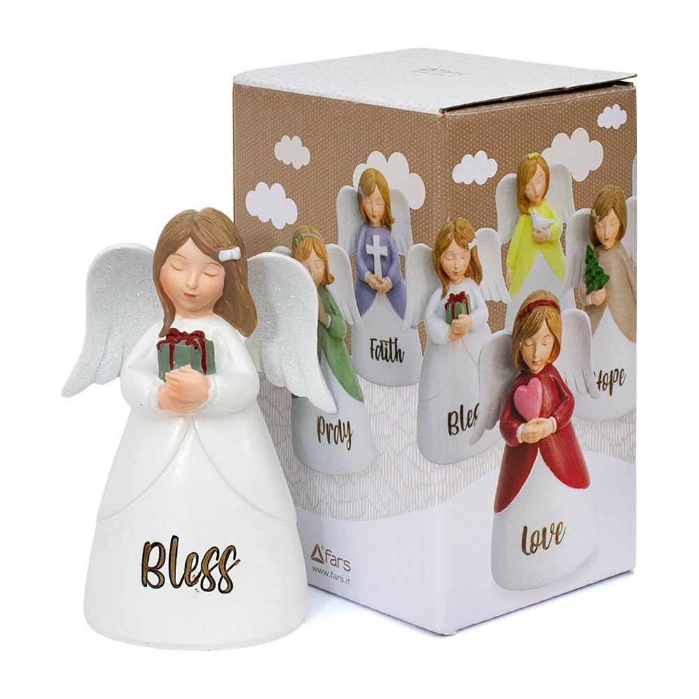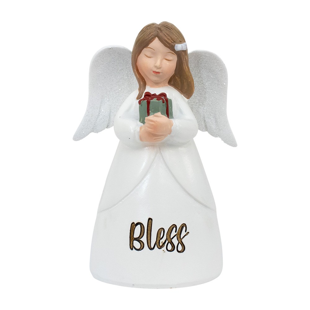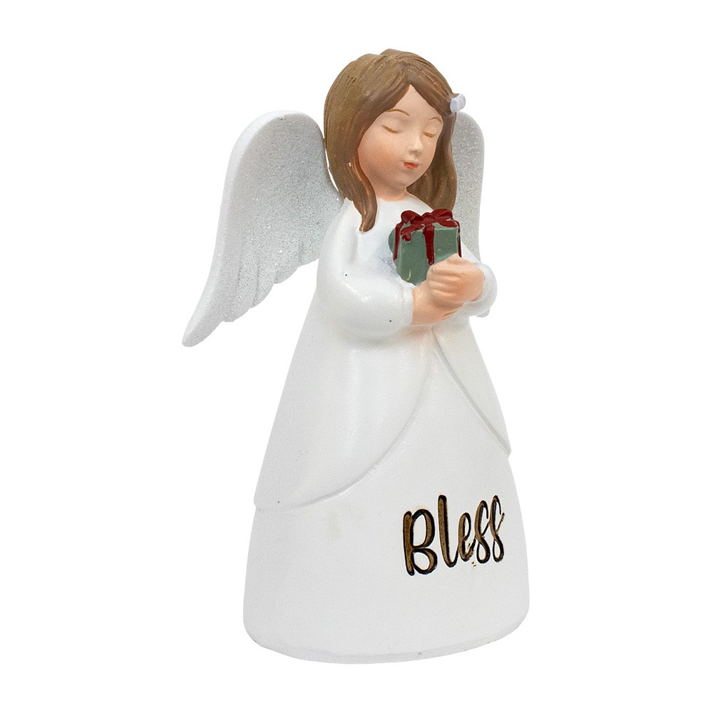 Statua angelo in resina colorato e dipinto a mano, con veste bianca con un piccolo pacco regalo tra le mani. Riporta la scritta "BLESS" e misura 11 cm di altezza.