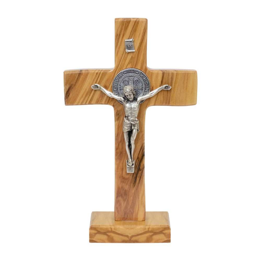 Crocifisso di San Benedetto con base in legno chiaro, realizzata con cura artigianale e impreziosito dal Corpo di Cristo e medaglia in metallo argentato.