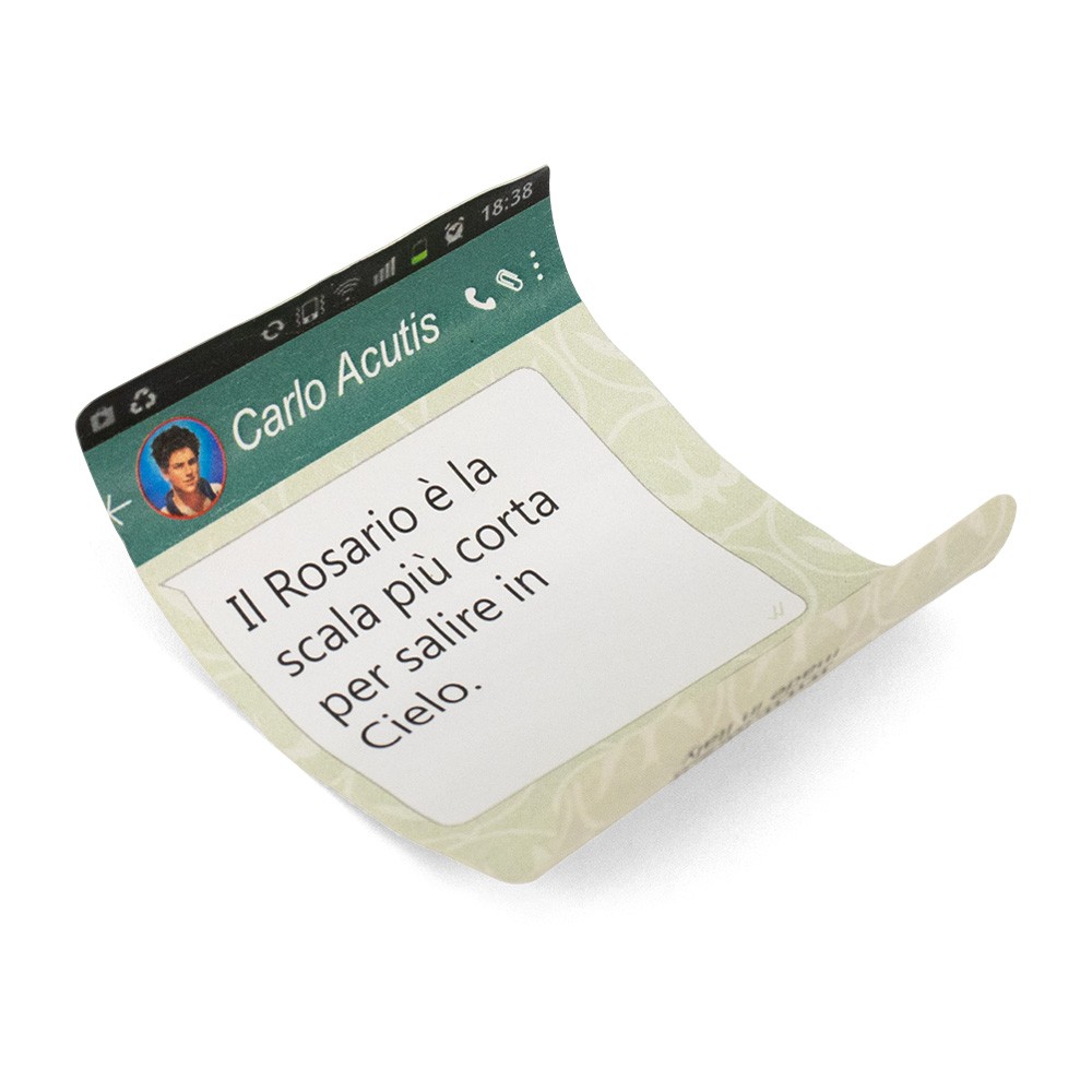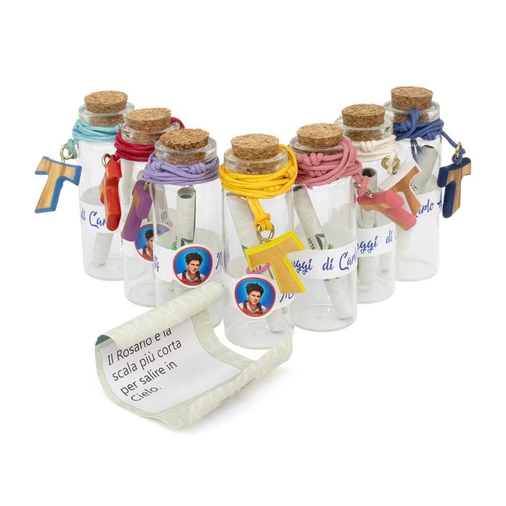 Ricordino dedicato a Carlo Acutis, pensato per ispirare fede e riflessione. La bottiglina in vetro con tappo in sughero contiene 25 messaggi assortiti e un pendente Tau con cordini colorati assortiti.