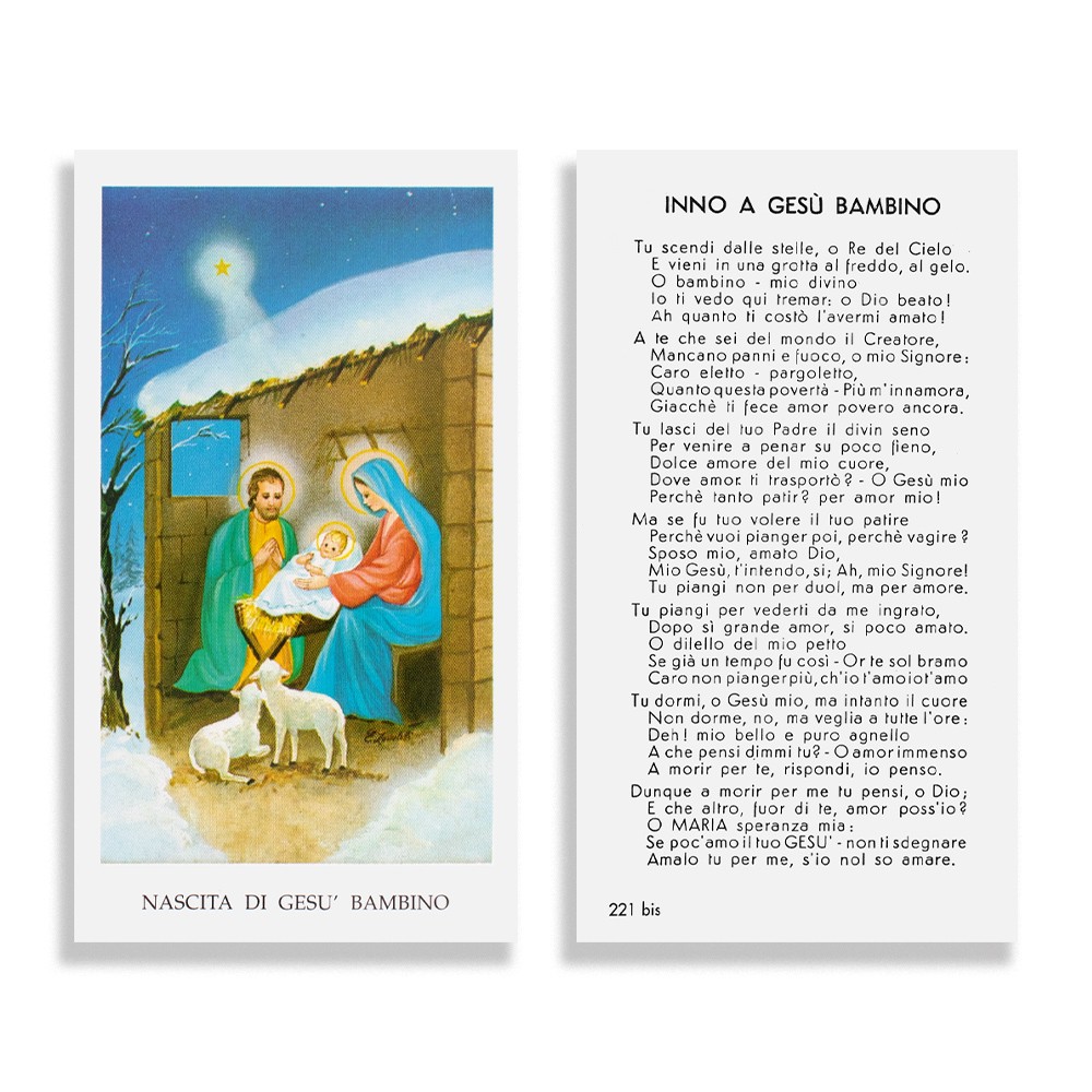 Santino Natività con preghiera sul retro. Misure 10,5 x 6 cm.