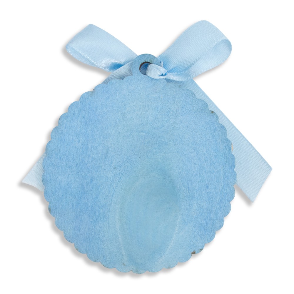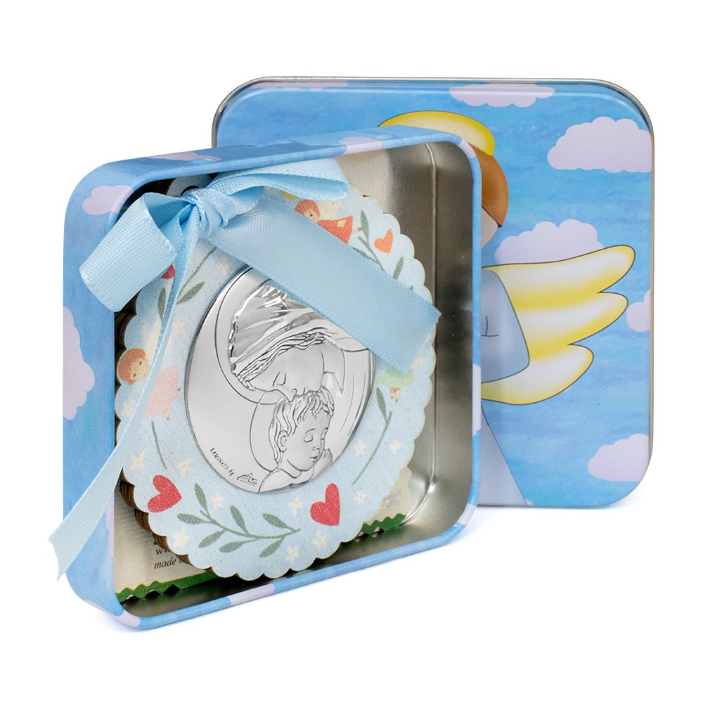 Il sopraculla è impreziosito da un delicato fiocco celeste e corredato di una raffinata scatola in latta, ideale anche come idea regalo per nascite e battesimi.