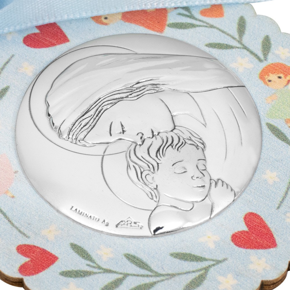 Carinissimo sopraculla celeste raffigurante la Madonna con il Bambino, realizzato in legno con placchetta in bilaminato a rilievo.