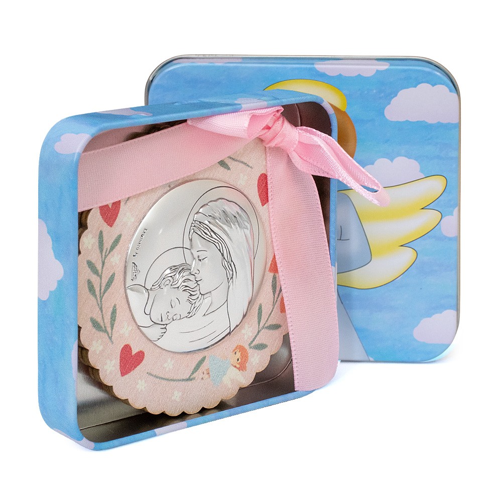 Completato da un fiocco rosa e racchiuso in un’elegante scatola in latta, è un pensiero perfetto per celebrare una nascita o un battesimo.