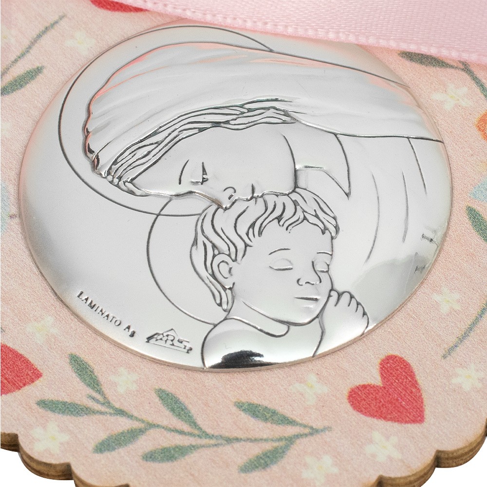 Dolcissimo sopraculla rosa con raffigurazione della Madonna con il Bambino, realizzato in legno con una placchetta in bilaminato a rilievo.