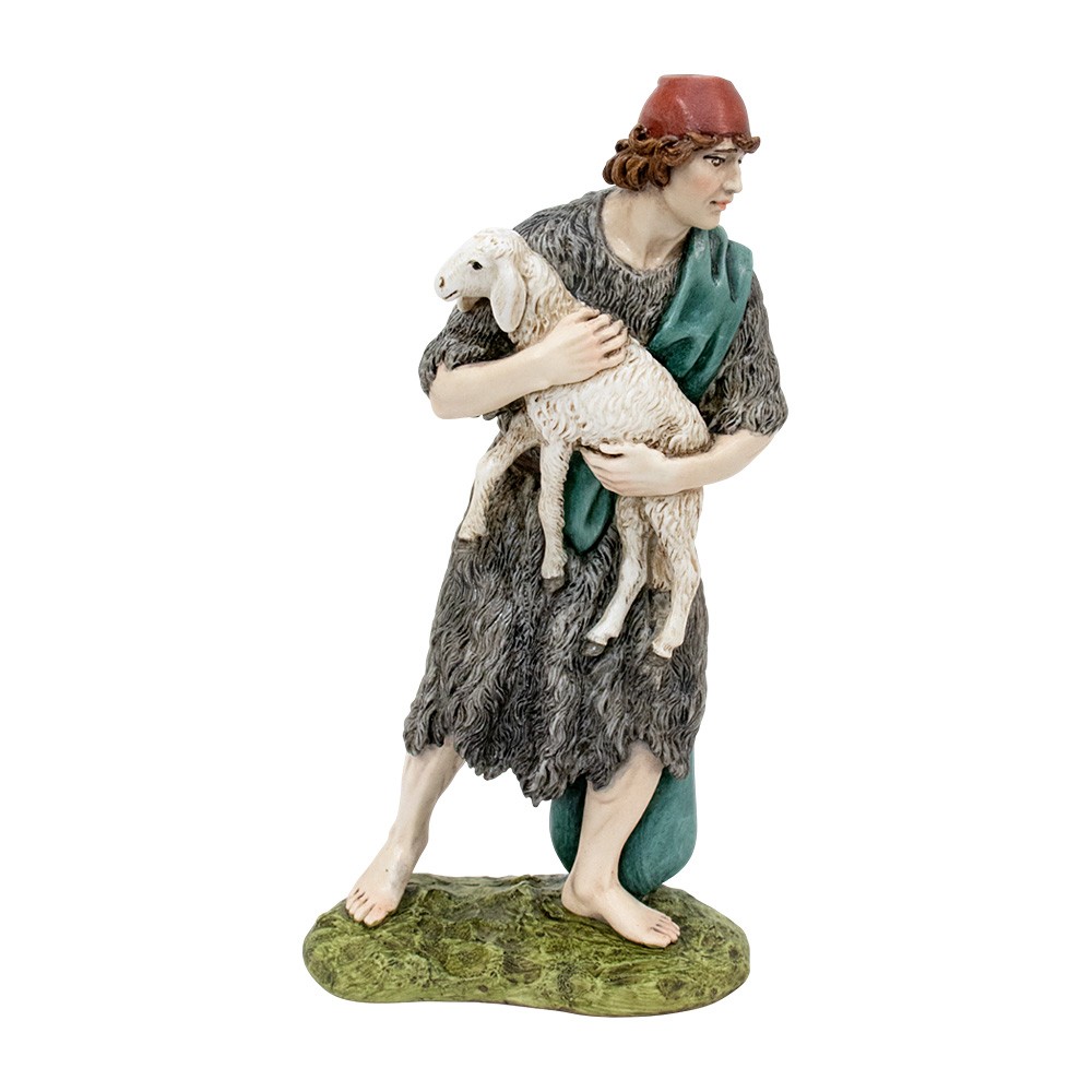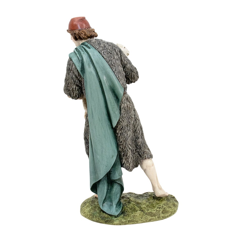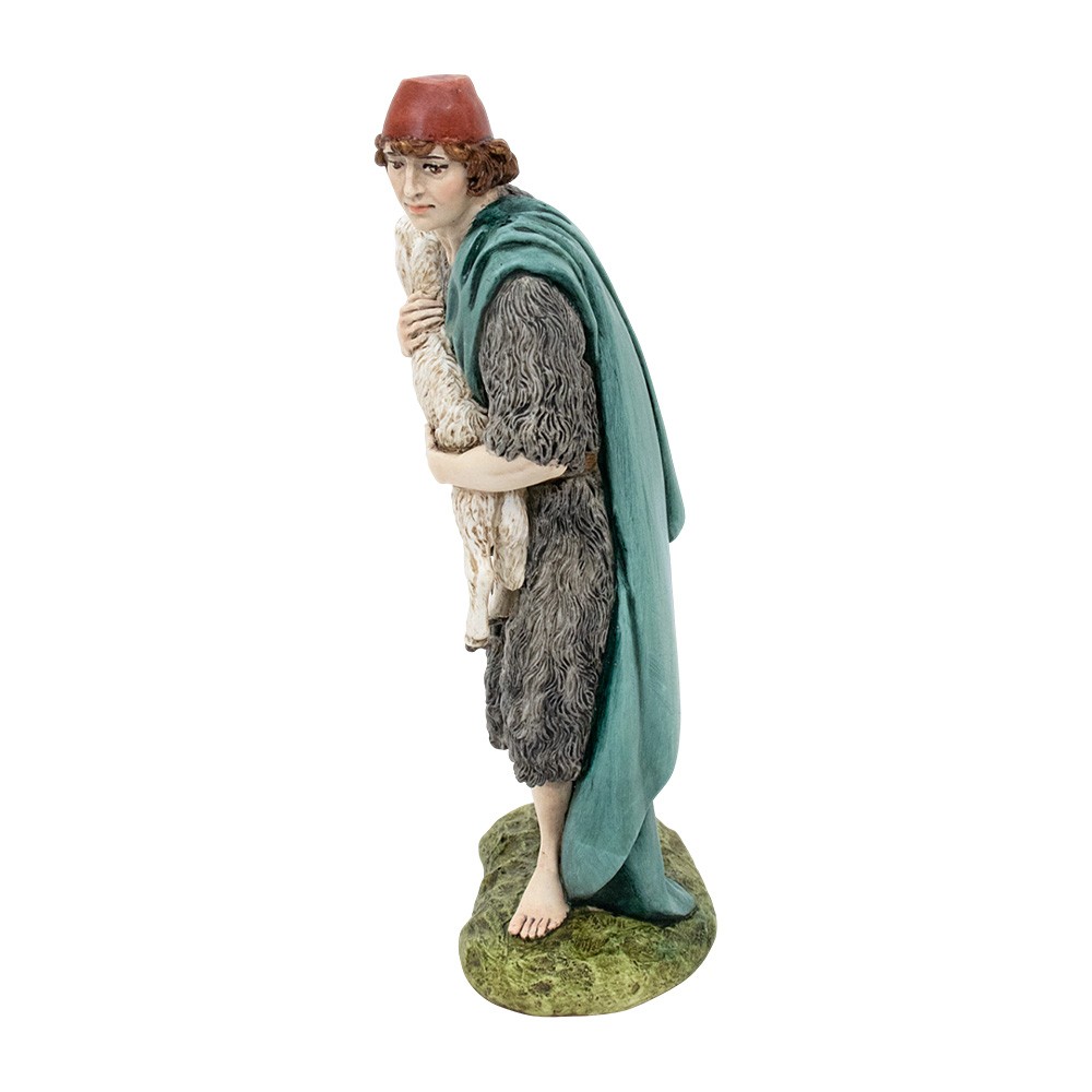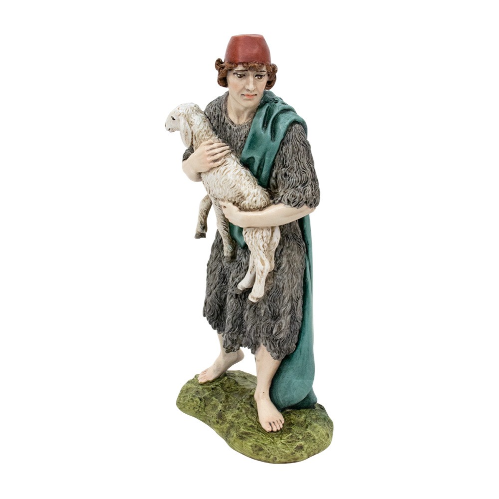 Buon Pastore in piedi con pecora della linea PRESTIGE stile arabo del presepe Landi /Moranduzzo realizzata interamente in resina, dipinta a mano e curata nei minimi particolari.