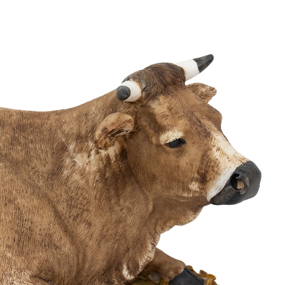 La statua del bue è realizzata in resina e dipinta finemente a mano, con grande cura dei dettagli e delle espressioni. Le proporzioni sono adatte per statue con altezza massima di 20 cm.