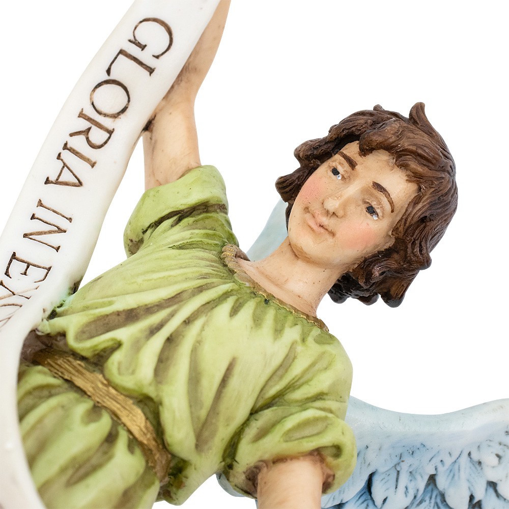 L'angelo è interamente in resina ed è dipinto finemente a mano, con grande cura dei dettagli. Le proporzioni sono adatte per statue con altezza massima di 20 cm.