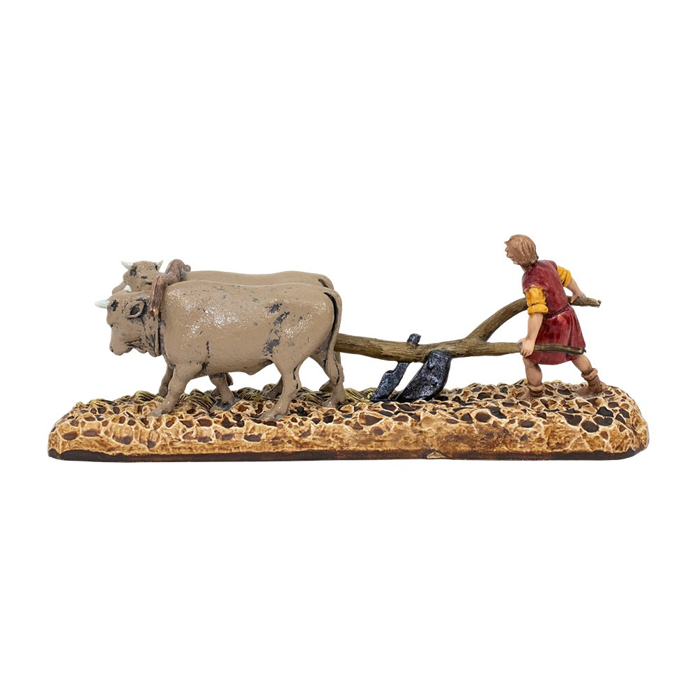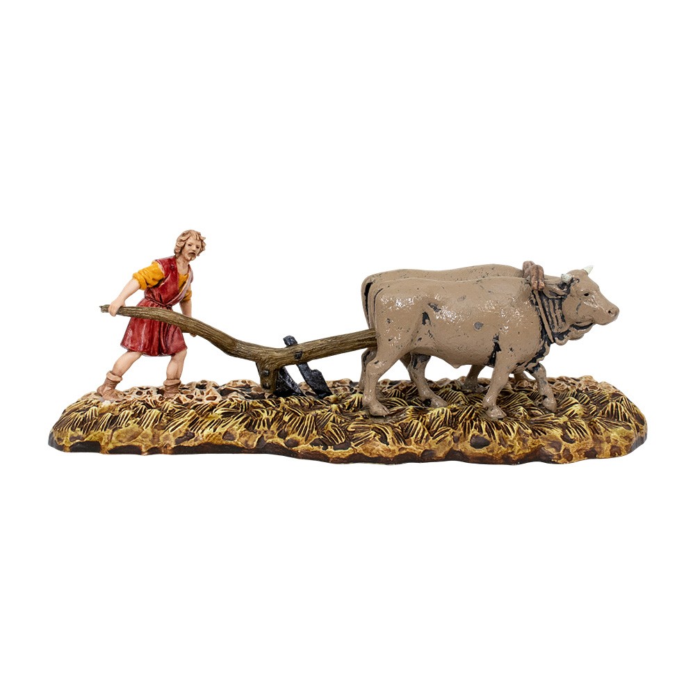 La statuetta è in PVC, un materiale estremamente leggero e resistente, dipinto a MANO. Raffigura un contadino a lavoro con il suo aratro.