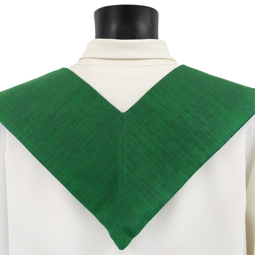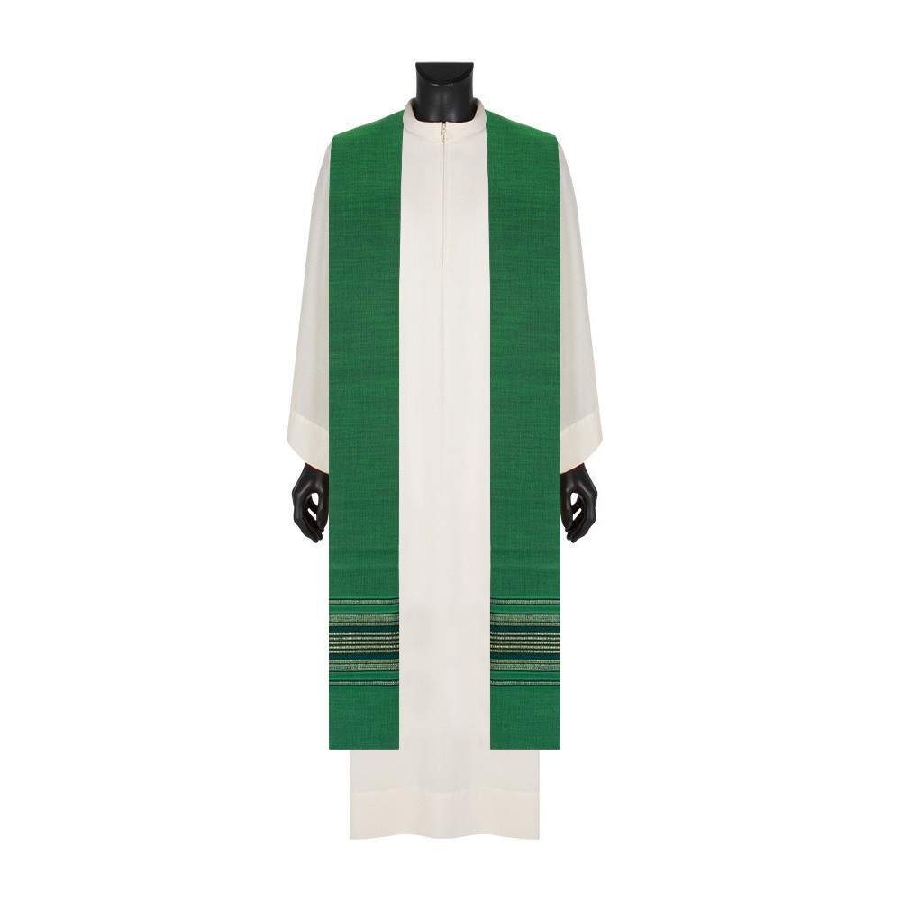 Questa stola sacerdotale di colore verde è realizzata in un pregiato tessuto misto di lana e lurex, offrendo un prodotto leggero e traspirante, perfetto per ogni celebrazione liturgica, anche durante la stagione estiva.