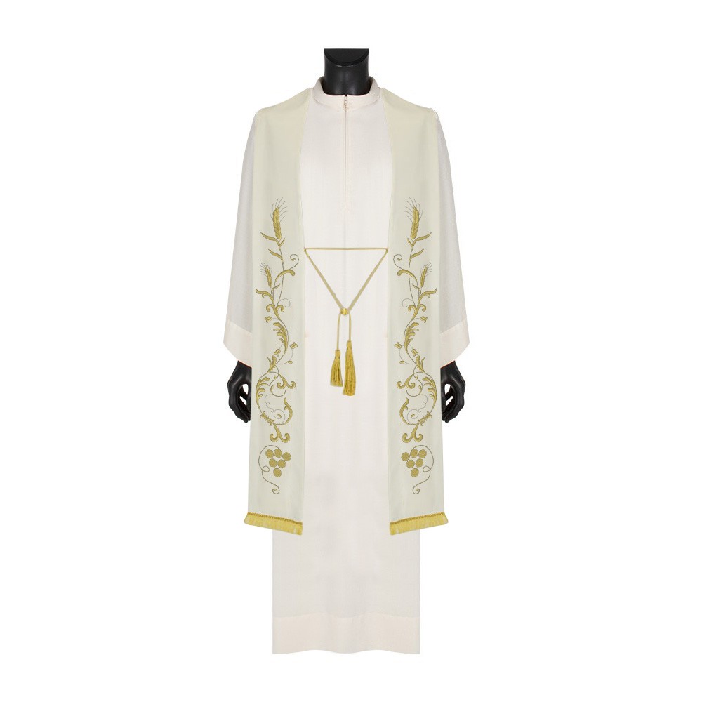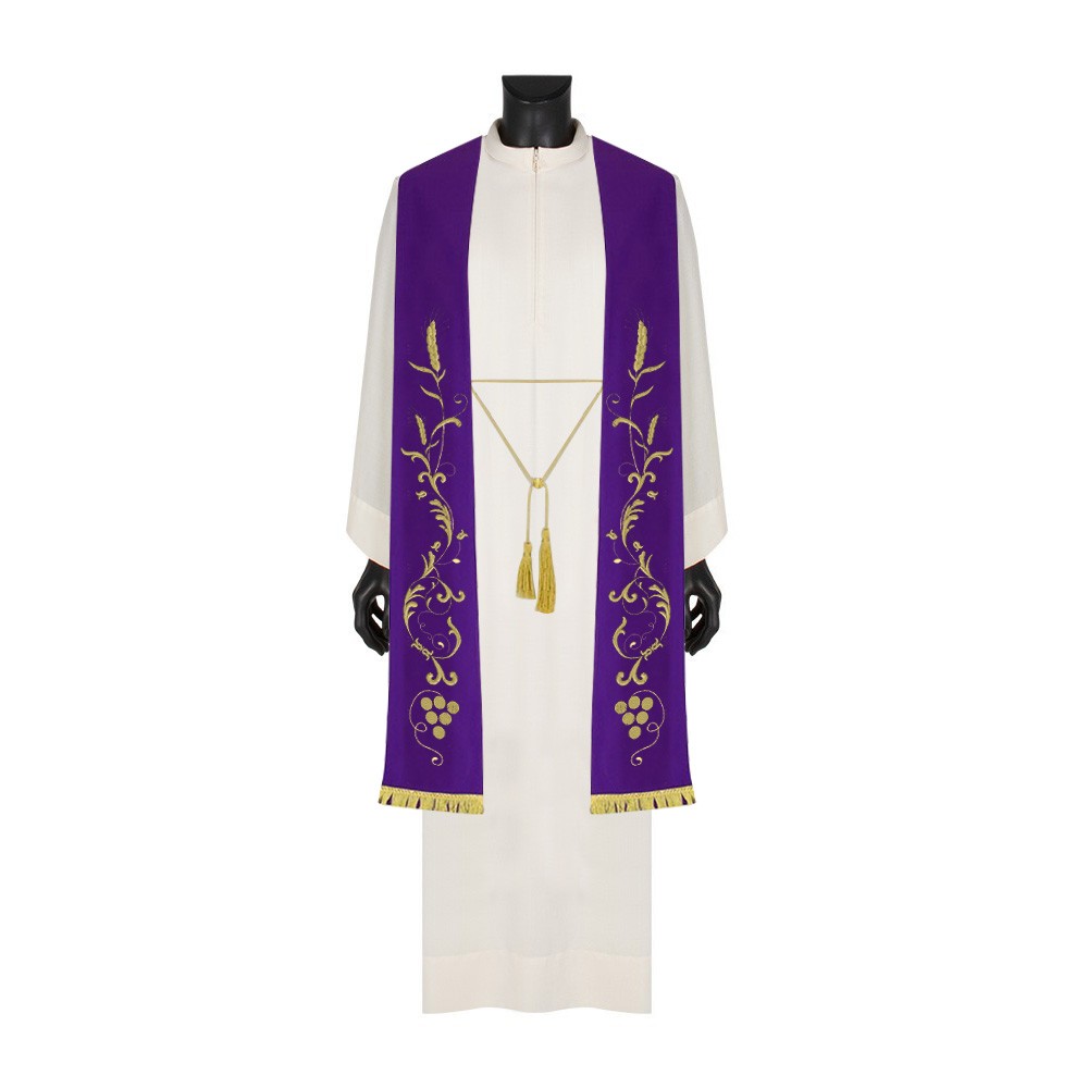 Stola sacerdotale con ricco ricamo in oro che decora l'intera lunghezza dei lembi.